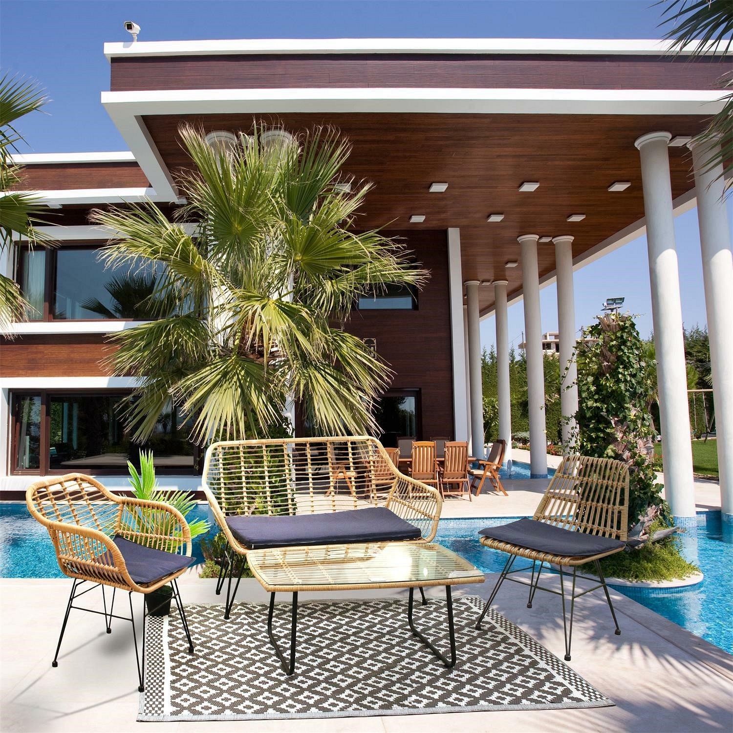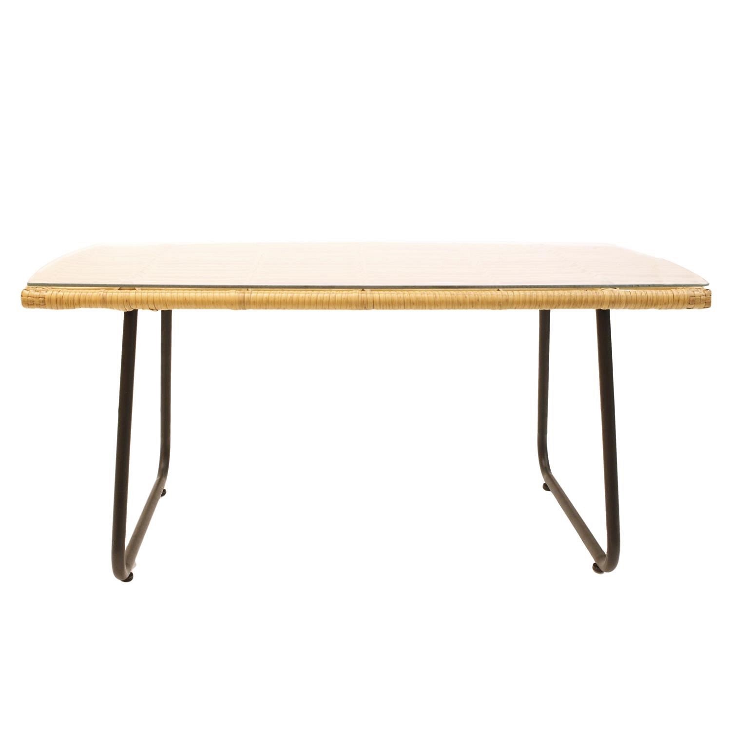 Blat stołu Surabaya wykonany jest ze szkła hartowanego oraz tworzywa sztucznego, który fantastycznie kontrastuje z metalowym stelażem oraz półką. Podstawę tworzą stalowe nóżki w kształcie płozy oraz w kolorze czarnym - użycie metody malowania proszkowo sprawia, że powierzchnia jest gładka i jednolita. Nóżki stolika zostały wyposażone w antypoślizgowe zakończenia. Stolik nadaje się do użytku wewnątrz i na zewnątrz. Waga: 9,7 kg Wymiary opakowania 48x59x80cm