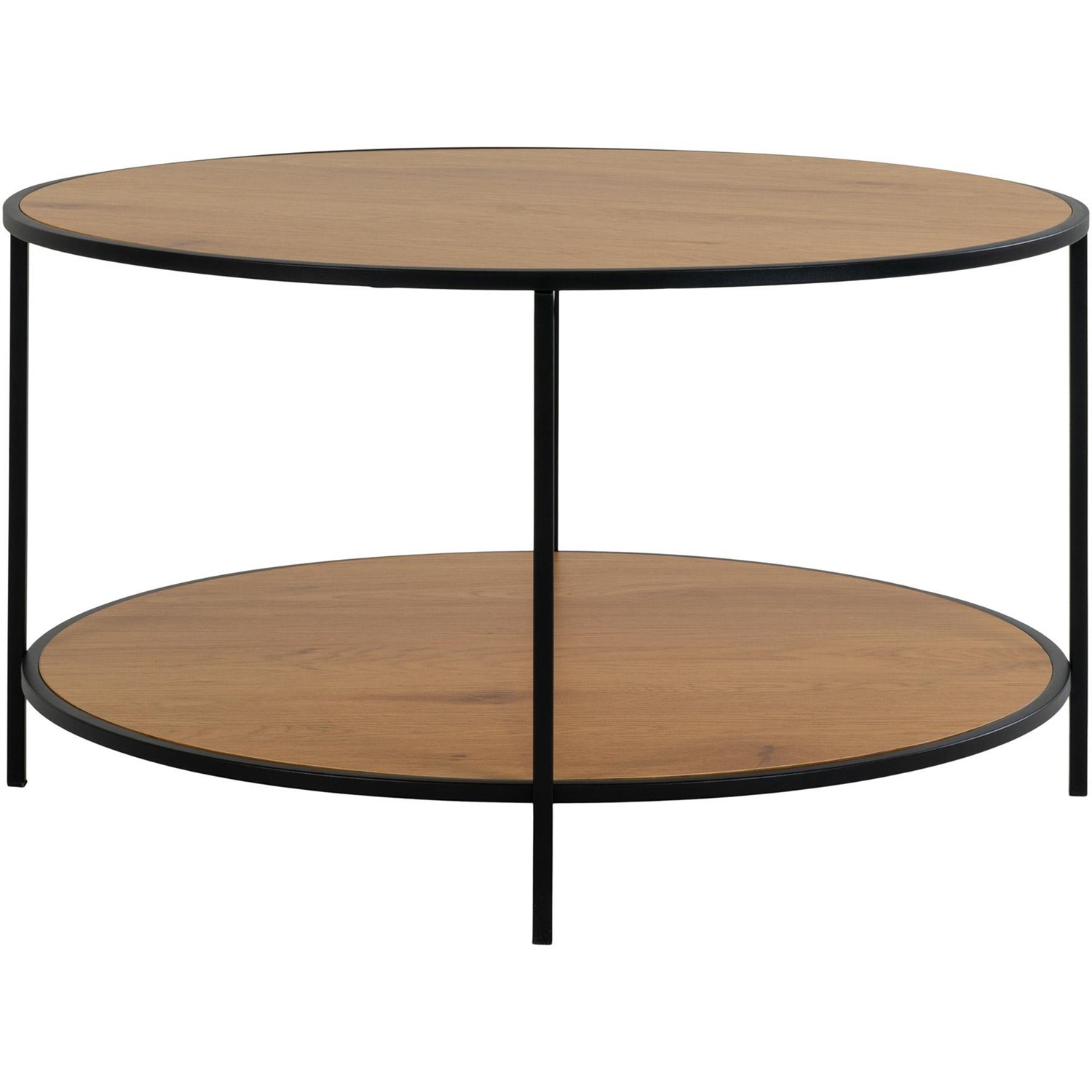 Stolik kawowy Vita w kolorze dębu naturalnego o średnicy 80 cm to elegancki i funkcjonalny mebel, idealny do nowoczesnych wnętrz. Jego okrągły blat wykonany jest z płyty wiórowej pokrytej okleiną imitującą słoje dębu, co nadaje mu naturalny i minimalistyczny wygląd. Czarna, malowana proszkowo podstawa stolika wykonana jest z metalu, co zapewnia stabilność i trwałość. Nóżki stolika zakończone są zaślepkami z tworzywa, które chronią podłogę przed zarysowaniami.
