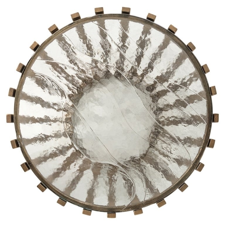 Okrągły, szklany blat oparto na ciekawie zdobionej podstawie wykonanej z metalu w złotej matowej kolorystyce.