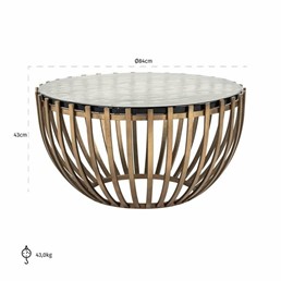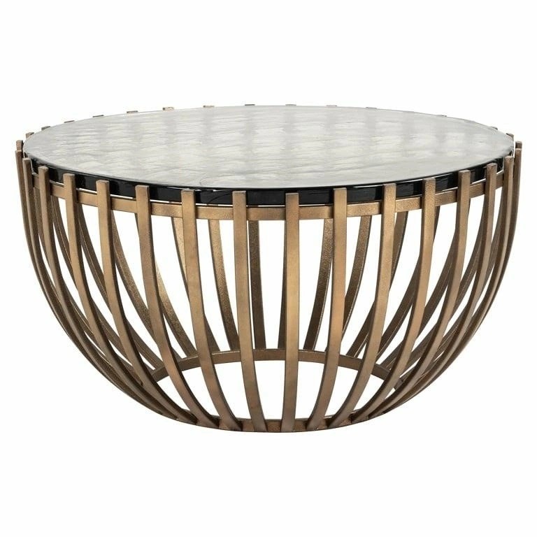 Okrągły, szklany blat oparto na ciekawie zdobionej podstawie wykonanej z metalu w złotej matowej kolorystyce.