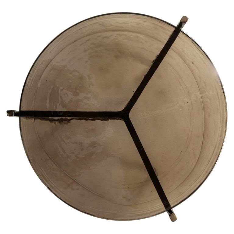 Stworzony został z ciemnego, zdobionego szklanego blatu i oparty na metalowej złotej podstawie.