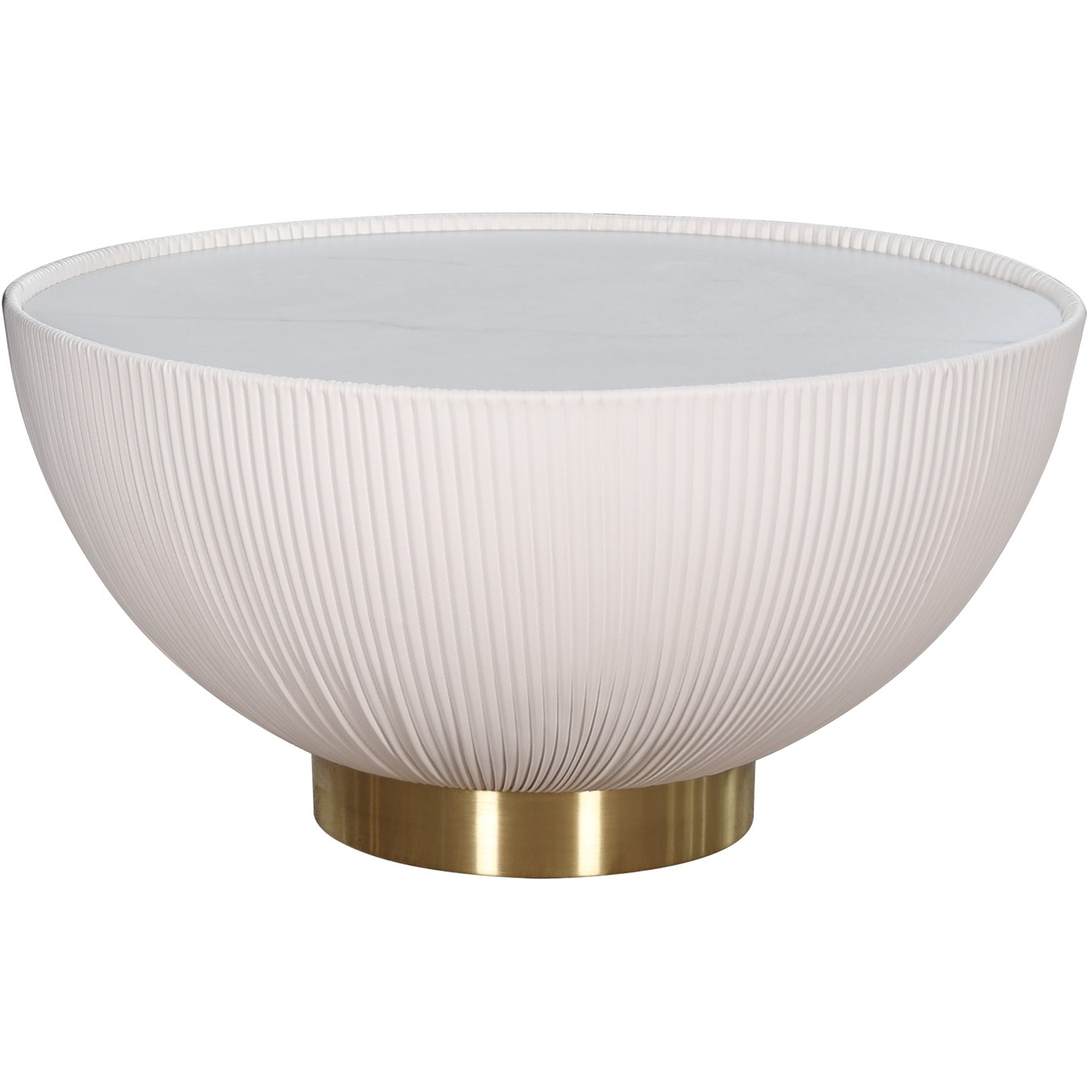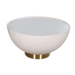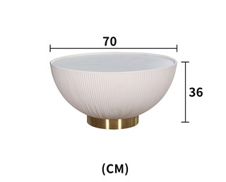 Stolik, który przykuwa uwagę swym nowoczesnym urokiem i wyrafinowanym stylem, prezentuje się jako wyjątkowe połączenie elegancji i funkcjonalności. Jego podstawa w kształcie półkuli, pokryta białą ekologiczną skórą o subtelnym pionowym plisowaniu, nadaje mu unikalnego charakteru i delikatnego, luksusowego wykończenia. Złoty akcent, który ozdabia górną krawędź podstawy, dodaje mu jeszcze większej wytworności i blasku, tworząc harmonijną kompozycję z bielą i marmurowym blatem. Okrągły blat, imitujący marmur, dodaje stolikowi lekkości i klasyki, równocześnie podkreślając jego nowoczesny charakter. Połączenie białej ekologicznej skóry, złotego akcentu i imitacji marmuru sprawia, że stolik emanuje wyjątkowym, luksusowym stylem, który doskonale wpisuje się w różnorodne aranżacje wnętrz.