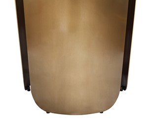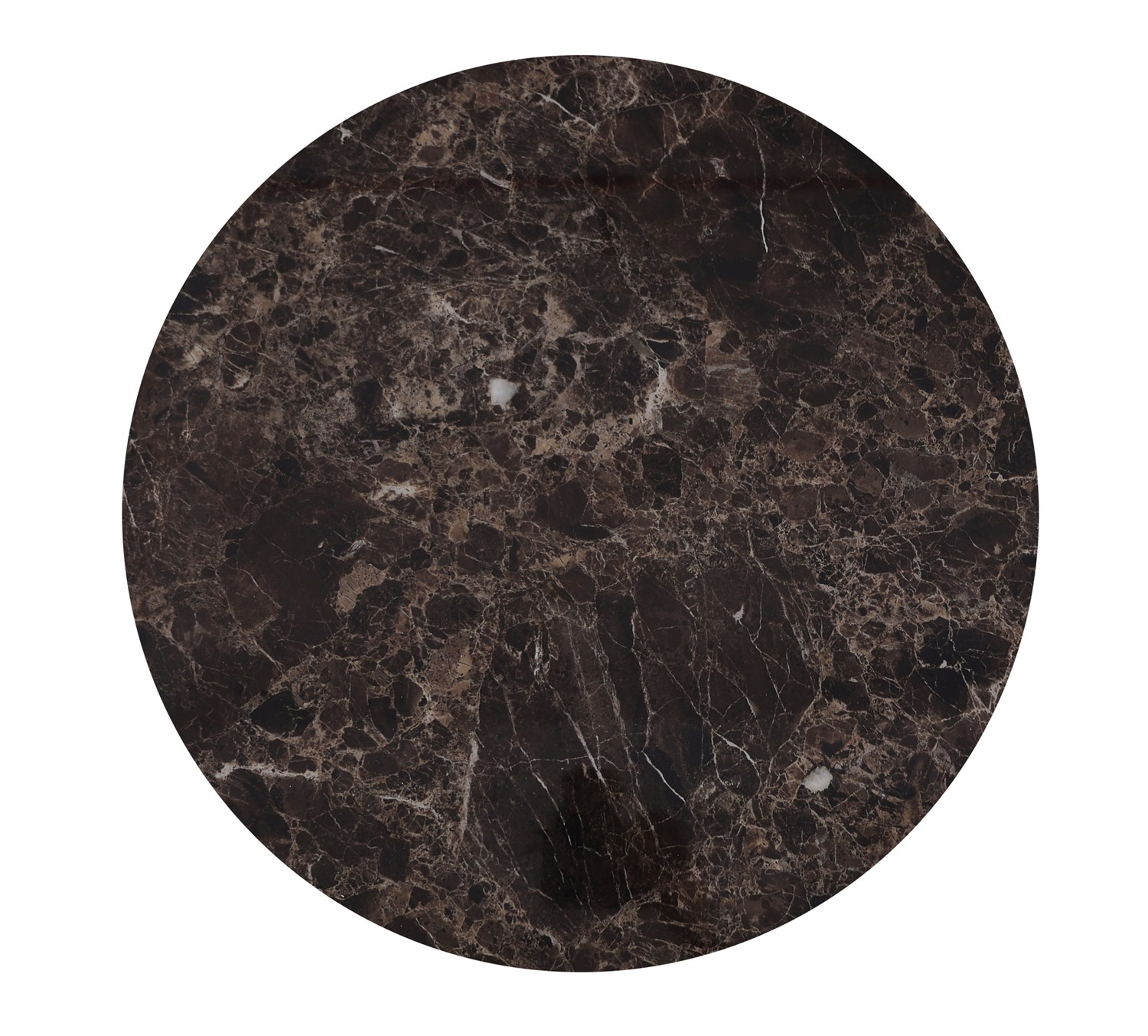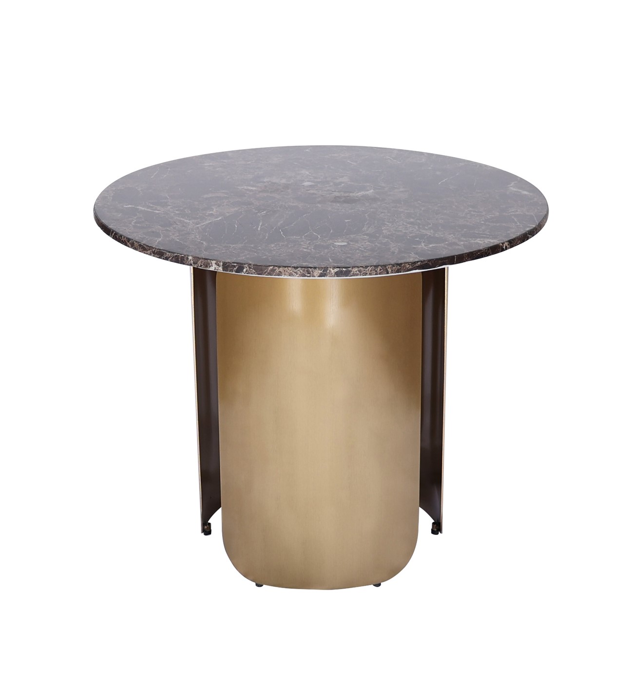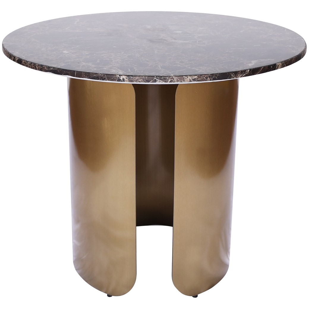 Elegancki stolik, który emanuje nowoczesnym wdziękiem i klasą. Jego okrągły blat o imitacji marmuru w bogatym brązowym odcieniu natychmiast przyciąga uwagę swoją subtelną teksturą i naturalnym wyglądem. Wykonany z wysokiej jakości materiałów, blat ten dodaje pomieszczeniu nuty luksusu i ekskluzywności. Nogi w kolorze złotym, które dodają delikatnego, lecz efektownego akcentu. Nogi te mają formę półokrągłych i zaokrąglonych tafli ze stali nierdzewnej, które połączone są w harmonijną kompozycję. Ich złocisty połysk wspaniale kontrastuje z ciepłym brązem blatu, tworząc efektowną grę świateł i odbić. Całość prezentuje się niezwykle stylowo i nowocześnie, doskonale wpisując się w trendy wystroju wnętrz.
