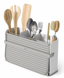 - Trzy sekcje umożliwiają przechowywanie sztućców, dużych przyborów kuchennych i akcesoriów do czyszczenia.