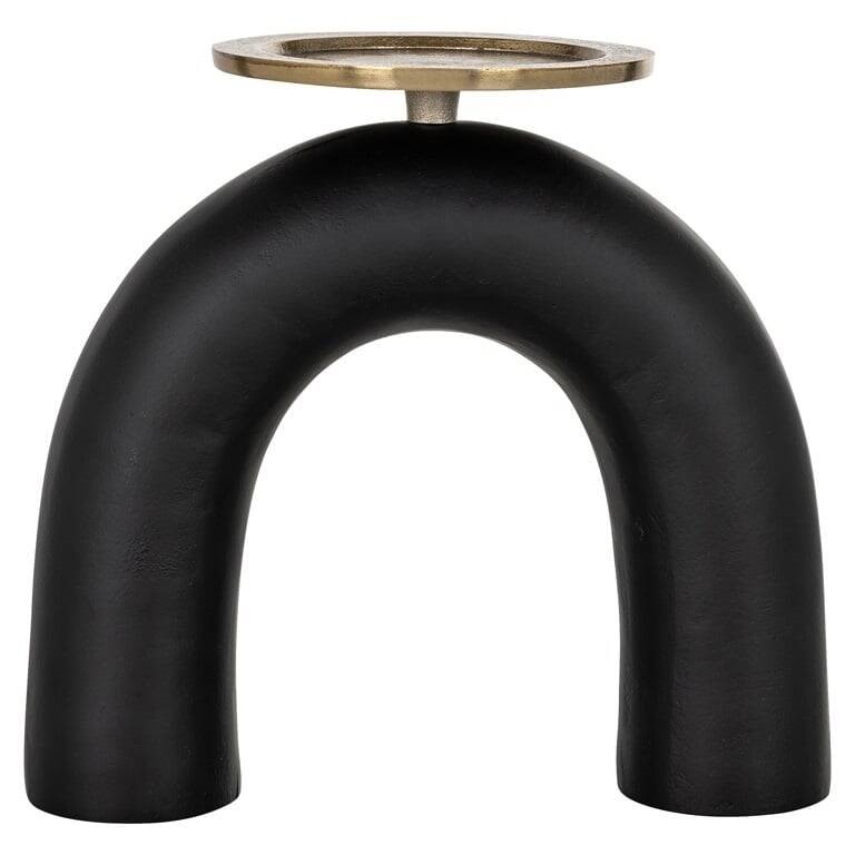 Złota postawa w kształcie odwróconej litery U opiera czarny talerzyk do umieszczenia świeczki.
