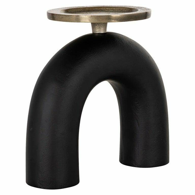 Złota postawa w kształcie odwróconej litery U opiera czarny talerzyk do umieszczenia świeczki.