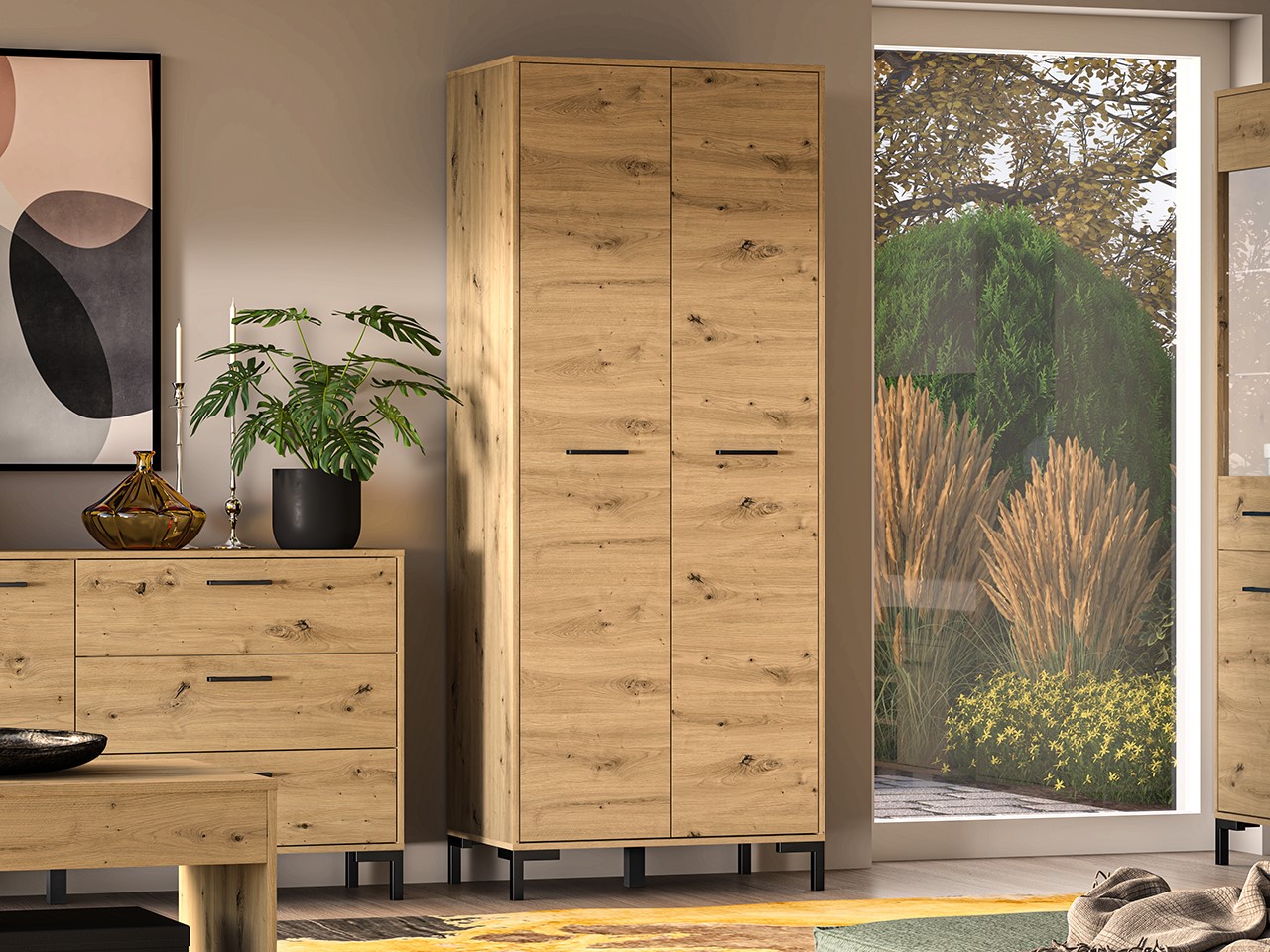 Szafa Nevio 17 to doskonały wybór dla miłośników naturalnych akcentów we wnętrzu. Ciepły odcień dębu artisan dodaje przytulności, a trwałe materiały sprawiają, że mebel jest odporny na codzienne użytkowanie. To praktyczne i eleganckie rozwiązanie do każdego pomieszczenia.