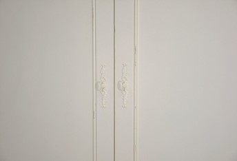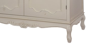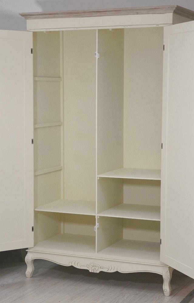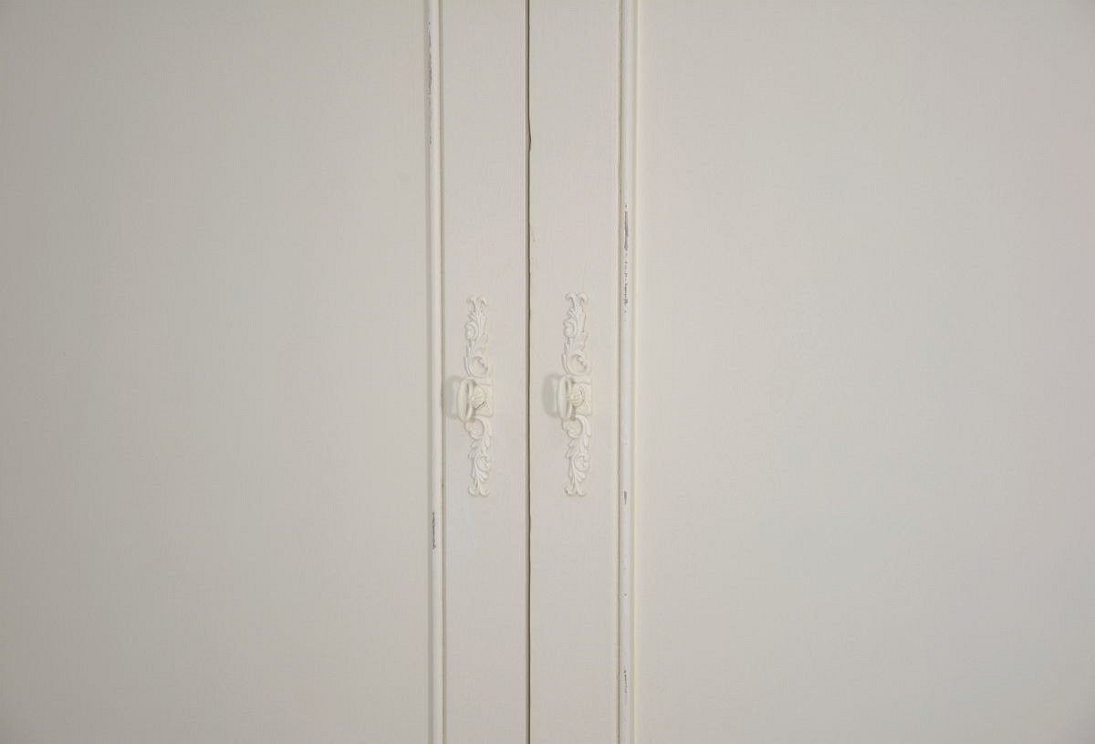 Dwudrzwiowa szafa prowansalska kremowa z jasnobrązowym wieńcem górnymi. Piękne rzeźbienia na drzwiach.