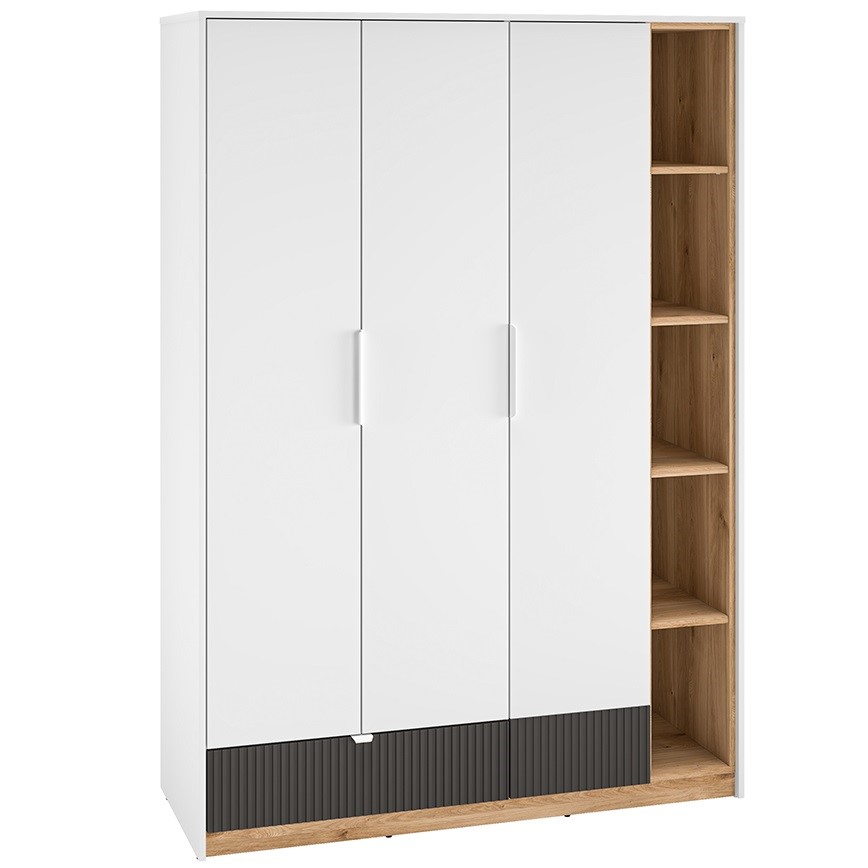 Szafa Torino 01 to praktyczna propozycja do nowoczesnych wnętrz, w której subtelna biel harmonijnie łączy się z castello miodowym i grafitowymi detalami. Dzięki pełnemu wysuwowi i zwiększonej ładowności szuflad zapewnia wygodne i funkcjonalne przechowywanie, a solidne wykonanie gwarantuje trwałość.