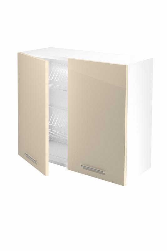 Modułowa szafka kuchenna o szerokości 80 cm z kolekcji mebli Halmari Vento. Szafka wyposażona jest w suszarkę do naczyń, która umieszczona nad zlewozmywakiem pozwala łatwo i szybko zapakować pranie. Szafka górna posiada regulowane wieszaki, które umożliwiają odpowiednie zawieszenie szafki na drążku. W szafce zastosowano zawiasy z mechanizmem cichego domykania, dzięki czemu zapobiegamy głośnemu hałasowaniu drzwi podczas użytkowania. Metalowy uchwyt o długości 128 mm ułatwia otwieranie i zamykanie szafki. Korpus szafki kuchennej 80 VENTO GC-80/72 ma białą matową powierzchnię z płyty wiórowej laminowanej oraz beżowy połyskujący front z płyty MDF z folią. Grubość płyty MDF oraz płyty laminowanej wynosi 16 mm.