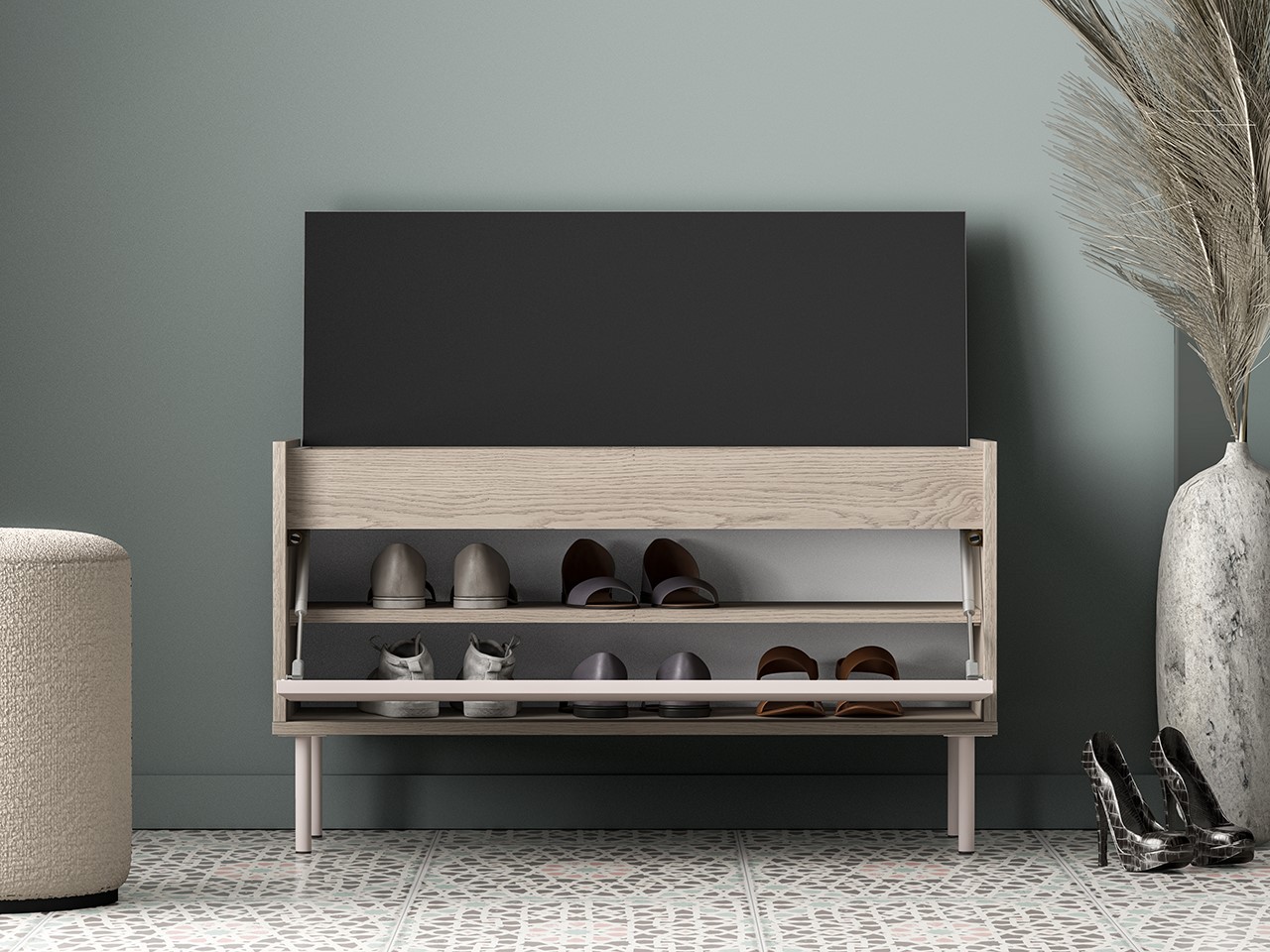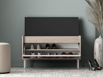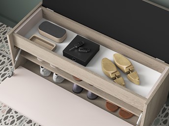 Szafka na buty Voco to funkcjonalny mebel do przedpokoju, który pozwala uporządkować obuwie i drobne akcesoria. Wyposażona w zamykane wnęki oraz szufladę lub klapę z opcjonalnym siedziskiem, ułatwia codzienne użytkowanie. Obniżony blat i otwarta półka pozwalają na wygodne odłożenie codziennych przedmiotów, a miękka tapicerka w modelach z siedziskiem zapewnia komfort przy zakładaniu butów. Metalowe nóżki ułatwiają sprzątanie, a zawiasy i siłowniki gazowe zwiększają wygodę użytkowania.