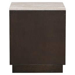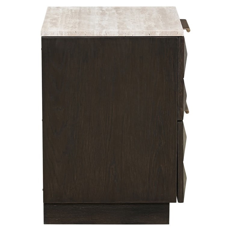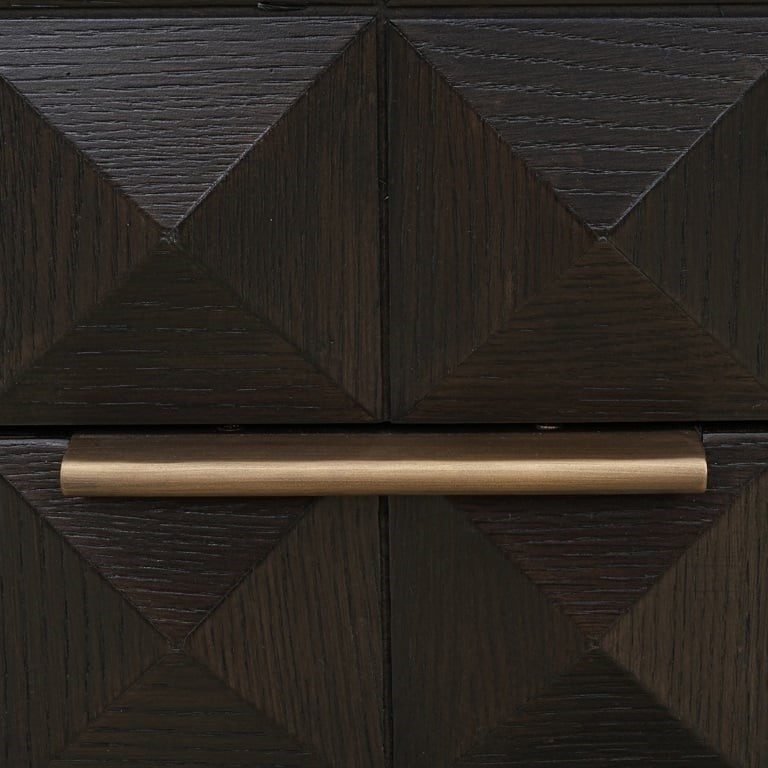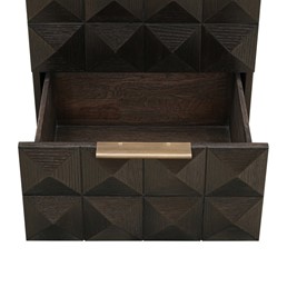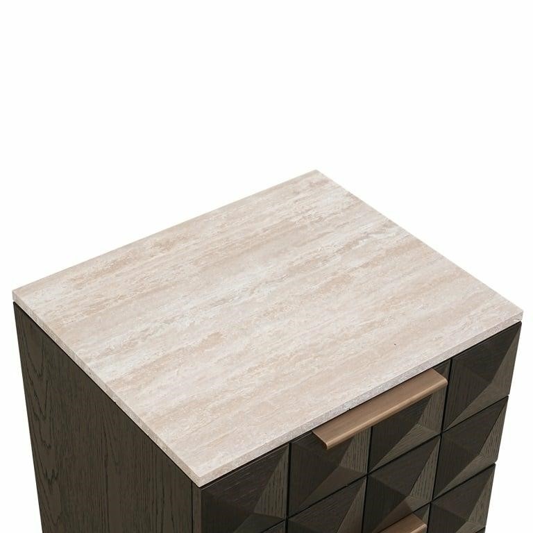 Szafka nocna Claremont to idealny przykład nowoczesnego designu, który łączy funkcjonalność z artystycznym wyrazem. Dzięki wyrafinowanemu połączeniu ciemnobrązowego dębu i efektownych powierzchni z trawertynu, mebel ten stanie się eleganckim i praktycznym elementem każdej sypialni. Wzór „siatki piramidalnej” nadaje niepowtarzalnego charakteru, wpisując się w ponadczasowe trendy.