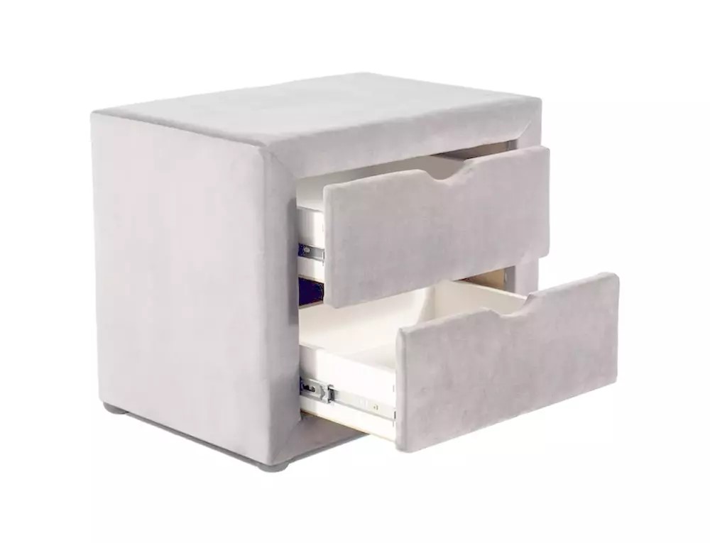 Szafka nocna ET-002 Velvet to elegancki mebel, który idealnie pasuje do nowoczesnych sypialni. Wykończona aksamitną tkaniną Bluvel 03 w jasnoszarym odcieniu, zapewnia funkcjonalność oraz stylowy wygląd.