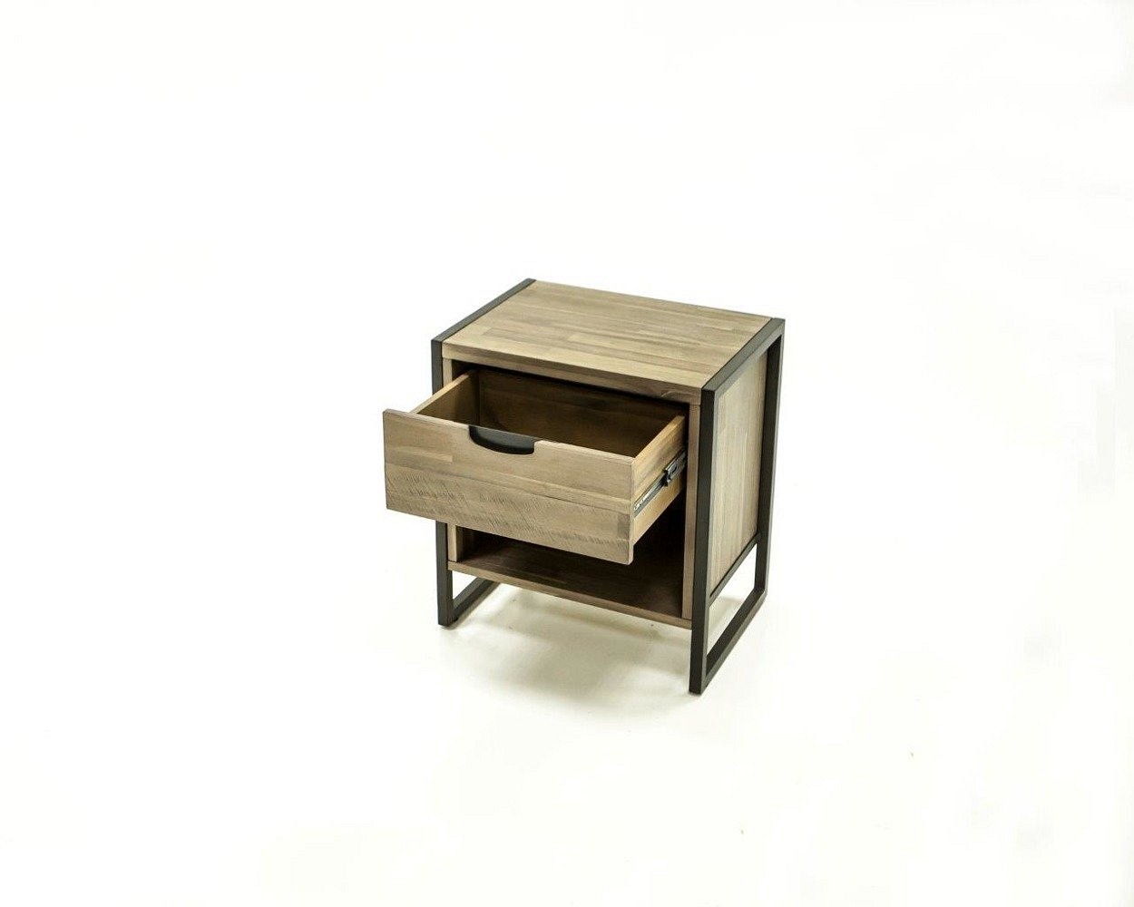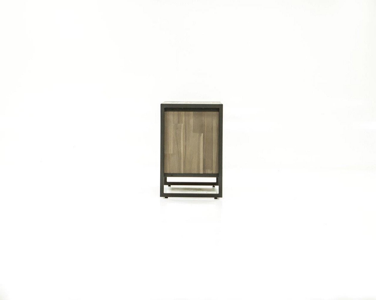 Oryginalna drewniana szafka w stylu loftowym, wykonana z wysokiej jakości czesanego egzotycznego drewna akacjowego, z frezowanymi uchwytami. Proste, grafitowe nogi ze szczotkowanego metalu w ciepłych tonach tworzą część ciała całego ciała. Detale frontowe i boczne wykonane są z drewna w kolorze piaskowym, tworząc niejednorodną strukturę. Produkt posiada półki i szuflady wyłożone aksamitem.