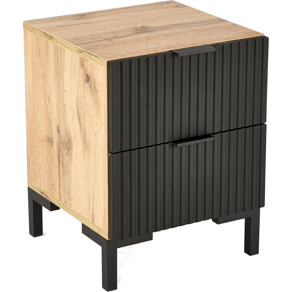 Wprowadź do swojej sypialni nutę elegancji i funkcjonalności dzięki tej wyjątkowej szafce nocnej. Jej urok polega na delikatnej równowadze między nowoczesnym designem a klasycznym wykończeniem. Szafka nocna o wymiarach 40/40/52 cm została starannie zaprojektowana, aby idealnie pasować obok łóżka, zapewniając zarówno praktyczne miejsce do przechowywania, jak i estetyczną wartość dla Twojej przestrzeni sypialnianej. Wykonana z trwałej płyty meblowej laminowanej i MDF okleinowanego, ta szafka łączy w sobie solidność i styl. Kolor Dąb Wotan nadaje jej ciepła i przytulności, natomiast czarne ozdobne fronty szuflad dodają wyrafinowanego charakteru i kontrastu.