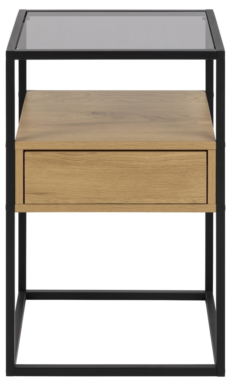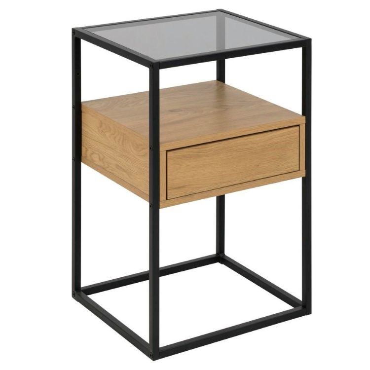 Szafka nocna Randolf w kolorze czarnego dębu to doskonały wybór, jeśli szukasz funkcjonalnego i stylowego mebla do swojej sypialni. Wykonana z wysokiej jakości drewna, co zapewnia trwałość i stabilność. Czarne wykończenie dębu nadaje elegancki wygląd. Nowoczesny design z funkcjonalnością. Szklany blat w kolorze czarnym nadaje jej nowoczesny wygląd, a szuflada w kolorze dębu dodaje ciepła i naturalnego charakteru.Takie połączenie kolorów sprawia, że szafka nocna będzie pasować do różnych stylów wnętrz, od minimalistycznych po bardziej klasyczne. Szuflada zapewnia dodatkowe miejsce do przechowywania drobiazgów, takich jak książki, okulary czy inne osobiste rzeczy, co czyni ją praktycznym rozwiązaniem w sypialni.