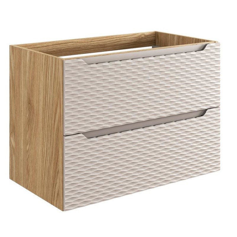 Szafka pod umywalkę OCEAN wyróżnia się frontami, na których pojawiają się delikatne, poziome fale, tworzące trójwymiarową formę. Te subtelne zdobienia dodają meblom elegancji i przypominają o nieustannej transformacji oceanicznego krajobrazu, wprowadzając do łazienki element natury. Wykonana z wysokiej jakości materiałów, szafka zapewnia trwałość i odporność na wilgoć, co jest kluczowe w łazienkowym środowisku. Solidne płyty laminowane oraz staranne wykończenie gwarantują długowieczność i estetyczny wygląd przez wiele lat. Szafka pod umywalkę oferuje przestronne szuflady, idealne do przechowywania kosmetyków oraz innych niezbędnych akcesoriów łazienkowych. Ergonomiczny układ wnętrza umożliwia wygodne przechowywanie, pomagając utrzymać porządek i organizację w łazience.