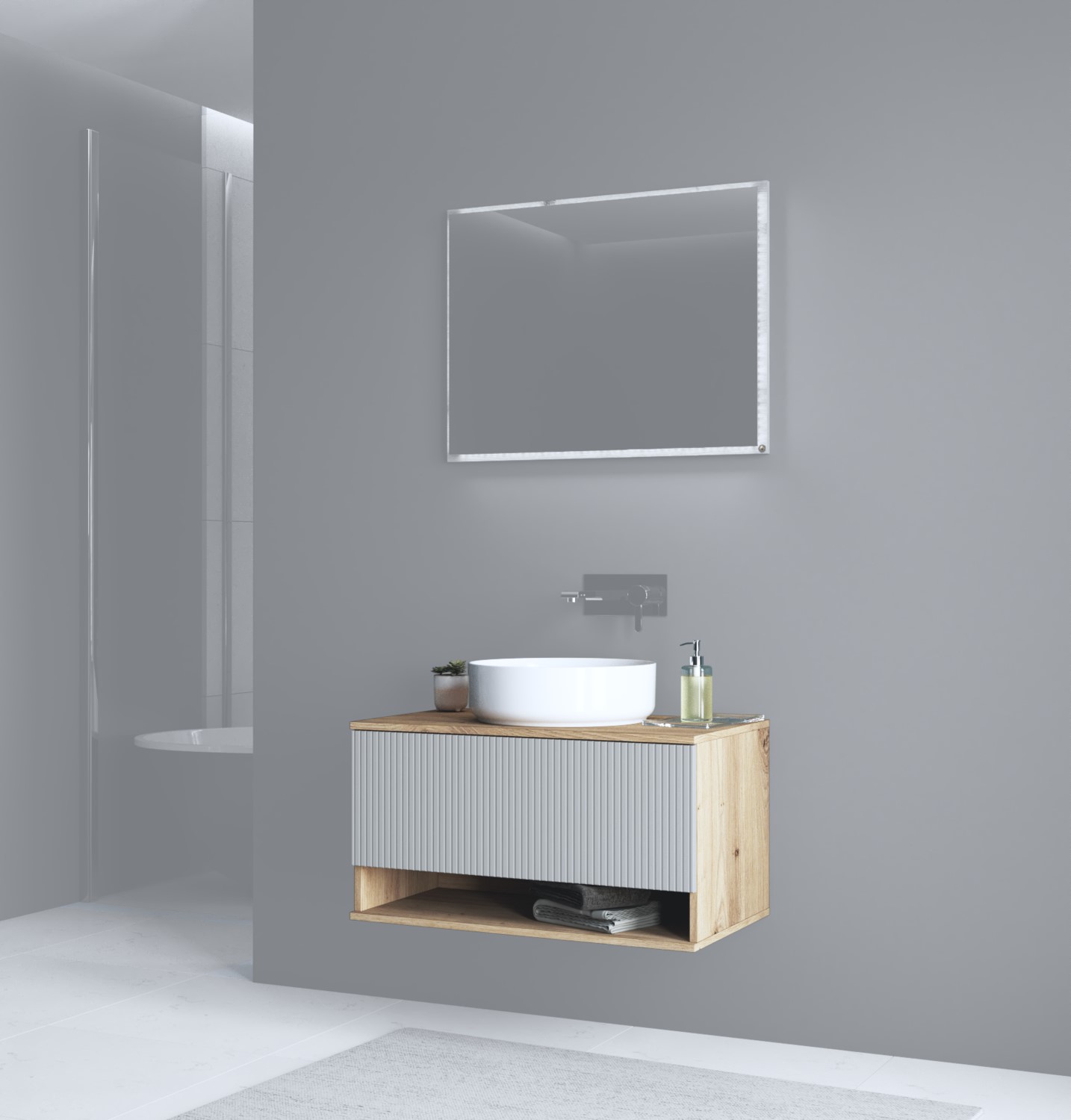 Szafka pod umywalkę AVIOLA 80/1S to funkcjonalny i stylowy element wyposażenia łazienki. Wykonana z trwałej płyty meblowej laminowanej, charakteryzuje się eleganckim wykończeniem. Korpus w kolorze dąb artisan doskonale komponuje się z matowym frontem w odcieniu cashmere, tworząc nowoczesny i estetyczny wygląd. Dzięki zastosowaniu zawiasów i prowadnic soft close, użytkowanie szafki jest komfortowe i ciche. Idealna do niewielkich łazienek, łączy praktyczność z atrakcyjnym designem.
