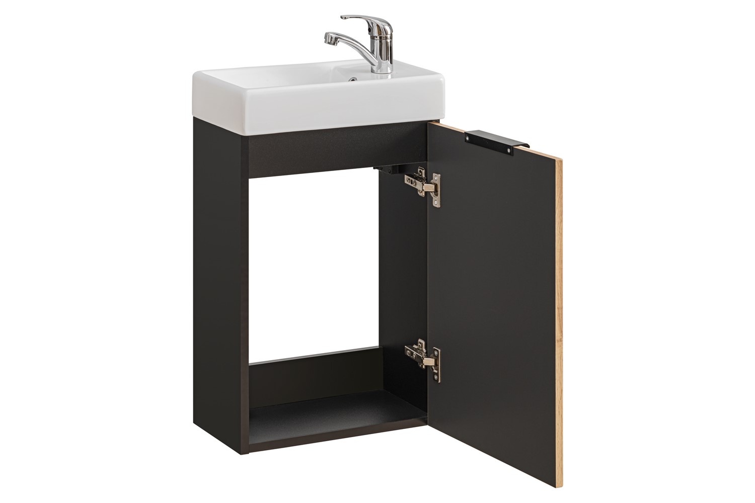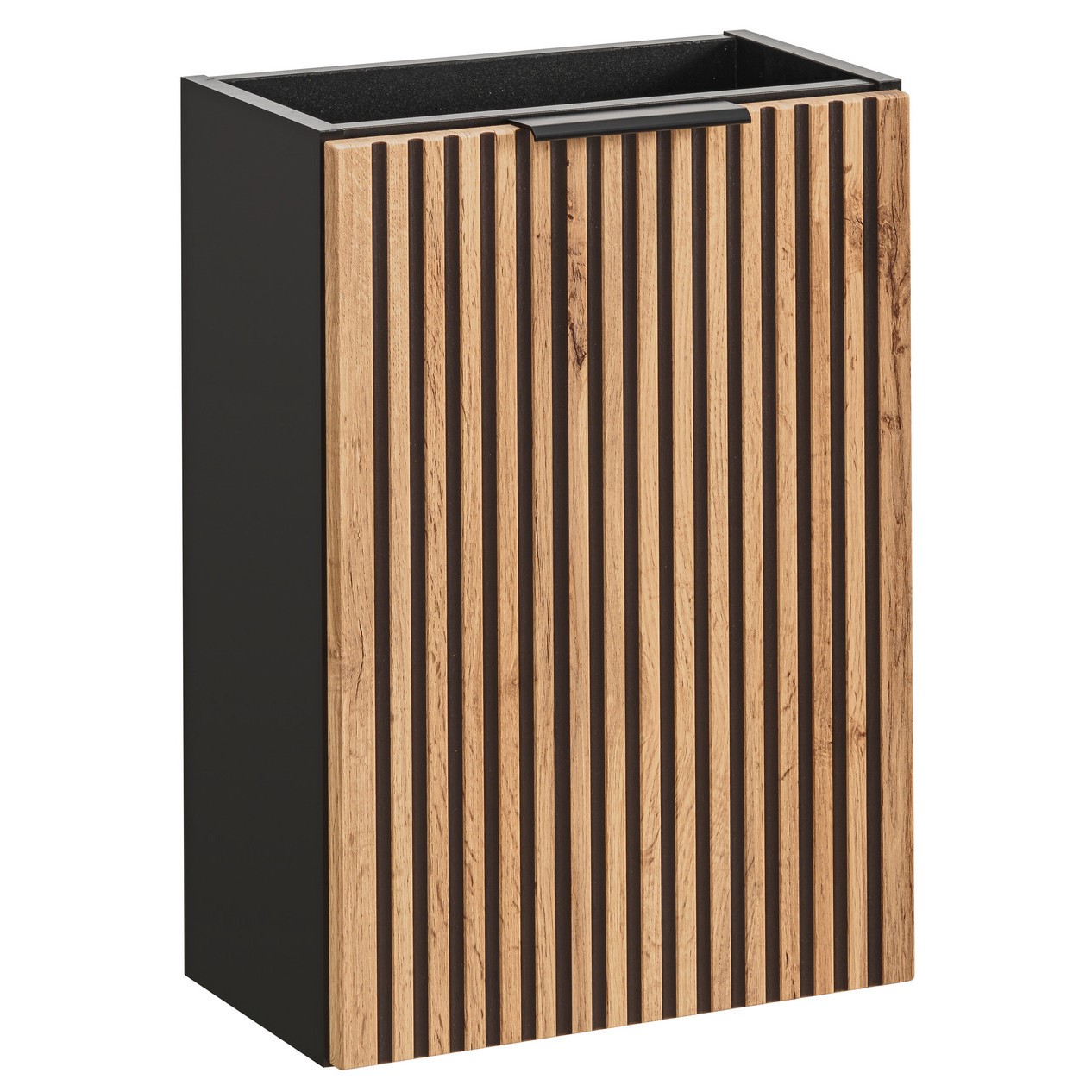 Szafka pod umywalkę z kolekcji Xilo to esencja nowoczesnego designu i funkcjonalności. Połączenie wyrazistych słojów Dębu Wotan z eleganckim czarnym ryflowaniem tworzy unikalny i stylowy wygląd, który doskonale wkomponuje się w każdą aranżację łazienkową. To idealne rozwiązanie dla osób ceniących sobie estetykę, trwałość i praktyczność w jednym. Szafka wykonana jest z wysokiej jakości płyty laminowanej i MDF, co zapewnia jej trwałość i odporność na wilgoć – kluczowe cechy w warunkach łazienkowych. Solidna konstrukcja i dbałość o detale sprawiają, że szafka ta posłuży przez wiele lat, zachowując swój estetyczny wygląd.