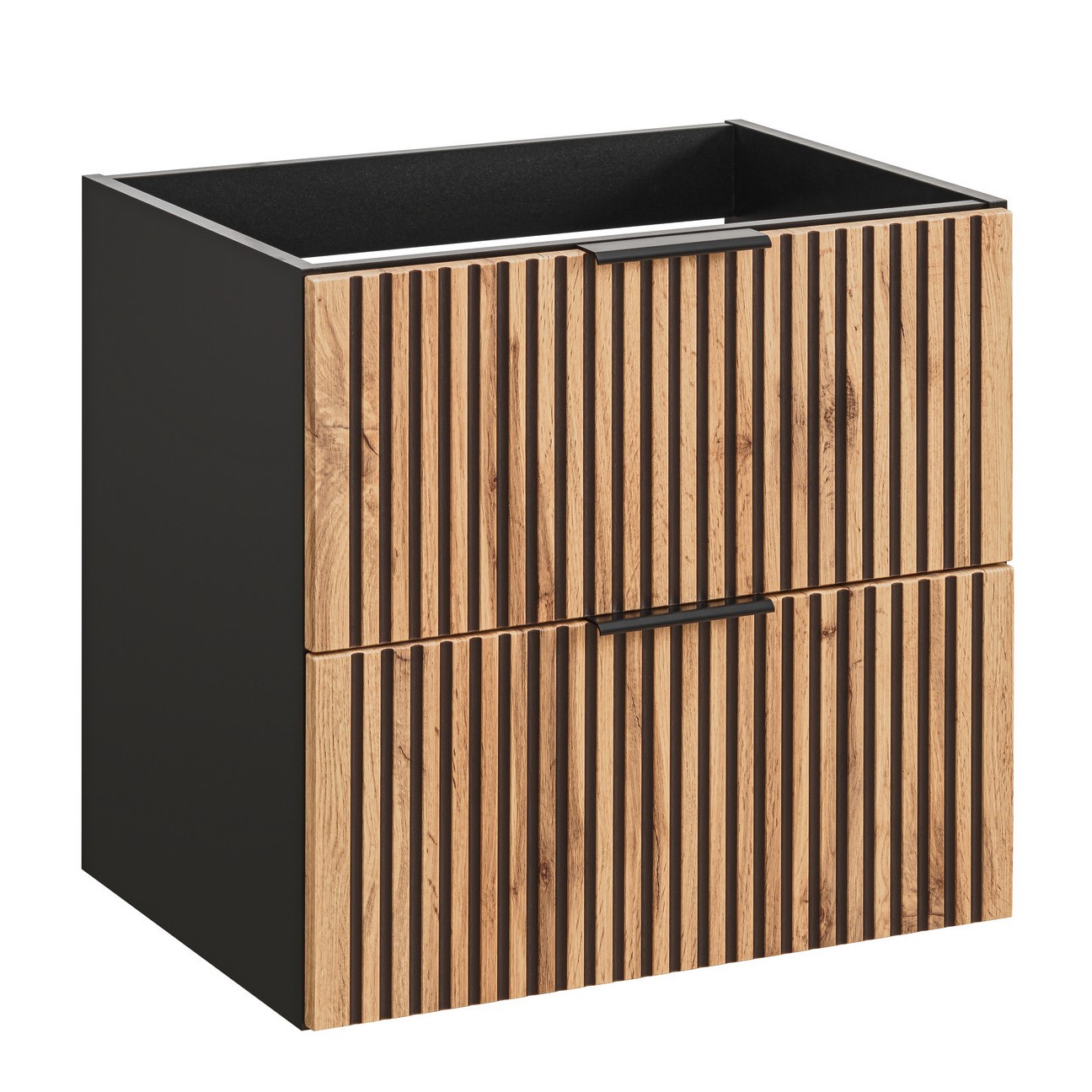 Szafka pod umywalkę z kolekcji Xilo to esencja nowoczesnego designu i funkcjonalności. Połączenie wyrazistych słojów Dębu Wotan z eleganckim czarnym ryflowaniem tworzy unikalny i stylowy wygląd, który doskonale wkomponuje się w każdą aranżację łazienkową. To idealne rozwiązanie dla osób ceniących sobie estetykę, trwałość i praktyczność w jednym. Szafka wykonana jest z wysokiej jakości płyty laminowanej i MDF, co zapewnia jej trwałość i odporność na wilgoć – kluczowe cechy w warunkach łazienkowych. Solidna konstrukcja i dbałość o detale sprawiają, że szafka ta posłuży przez wiele lat, zachowując swój estetyczny wygląd.