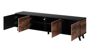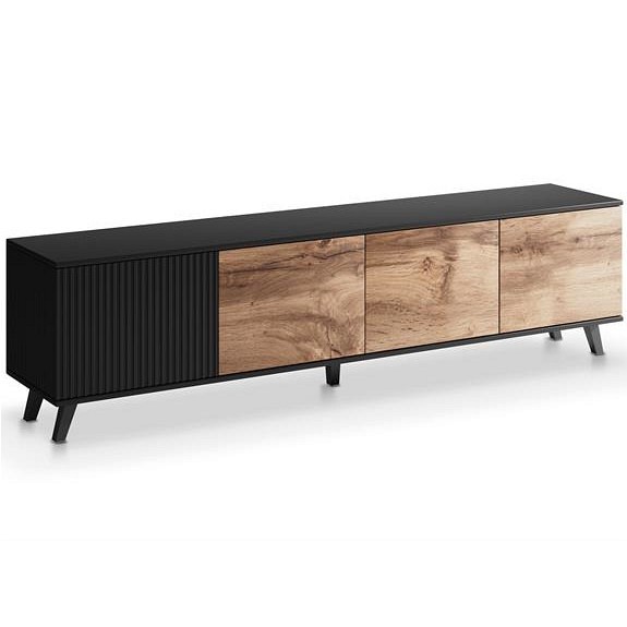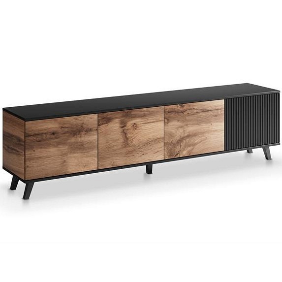 Szafka RANDOM 3 RTV szer. 200 cm o oryginalnym designie, idealna do wnętrz w stylu industrialnym. Szafka pod telewizor RANDOM 2 jest wysoce odporna na uszkodzenia mechaniczne i wilgoć, a jej wykonanie z połączenia płyty MDF i okleiny meblowej zapewnia długą żywotność. Szafki RTV z dębu wodnego i czarnego drewna będą pięknym dodatkiem do loftowego salonu. Szafka RTV wyposażona jest w wygodną zamykaną szafkę, która zapewnia dodatkowe miejsce do przechowywania.
