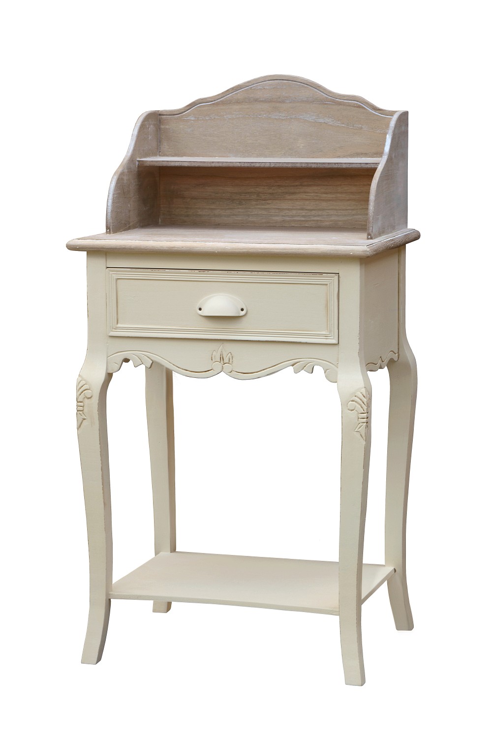 Kremowa szafka z nadstawką to coś więcej niż tylko stojąca szafeczka. Ubogacona o nadstawkę z dwiema pólkami zyskuje dodatkowe miejsce na drobiazgi. Mebel wykonany jest z drewna topoli i wzmocniony płytą meblową mdf, dzięki czemu jest solidny i trwały. Delikanta beżowa kolorystyka i subtelne przetarcia dodają szafce elegancji.