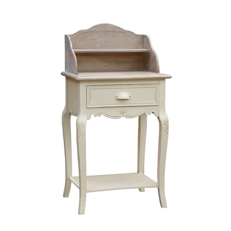 Kremowa szafka z nadstawką to coś więcej niż tylko stojąca szafeczka. Ubogacona o nadstawkę z dwiema pólkami zyskuje dodatkowe miejsce na drobiazgi. Mebel wykonany jest z drewna topoli i wzmocniony płytą meblową mdf, dzięki czemu jest solidny i trwały. Delikanta beżowa kolorystyka i subtelne przetarcia dodają szafce elegancji.