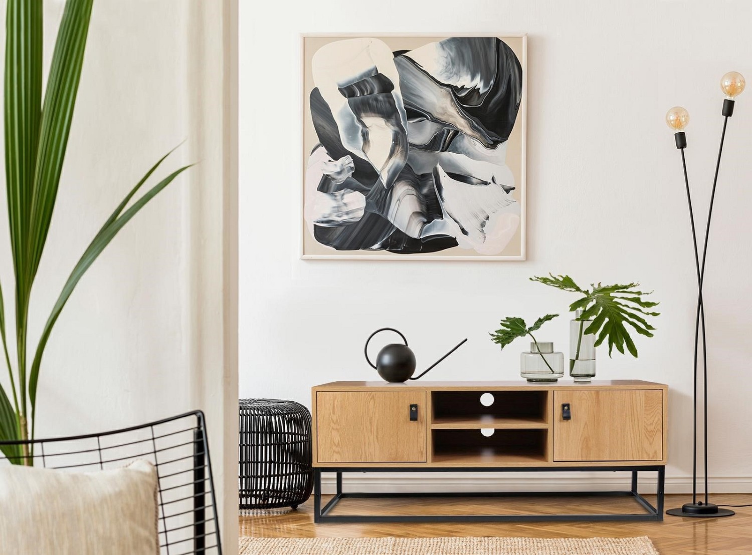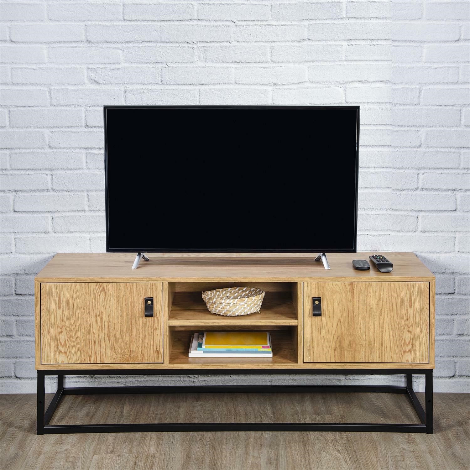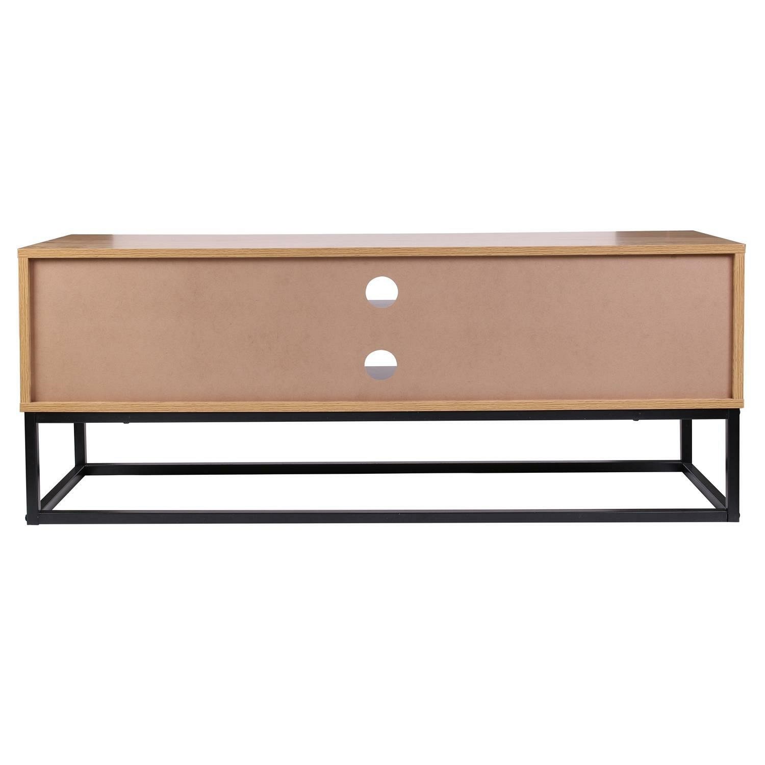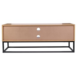 Szafka RTV to mebel niezbędny w każdym salonie. Choć bardzo zgrabna – wyjątkowo pojemna. Niewielkie gabaryty pozwalają pomieścić wszystko, co w takiej szafce powinno być pod ręką. Szafka posiada dwie szafki zamykane z uchwytem z eko skóry i dwie otwarte, przestronne półki. Do tego gładki blat, który stanowi dodatkową przestrzeń użytkową. Zamiast tradycyjnych nóg, wykorzystaliśmy metalowy czarny malowany proszkowo stelaż, na którym mebel solidnie wspiera swój ciężar. Szafka RTV powstała z bardzo mocnej i odpornej na intensywne użytkowanie płyty laminowanej. Elegancki kolor w odcieniu złotego dębu, z dekorami imitującymi do złudzenia naturalne wybarwienie i słoje drewna, uzupełnia stalowa konstrukcja w kolorze czarnym. Waga szafki: 21 kg Max ilość szt. w kartonie: 1 Wymiary kartonu: 120cm x 40cm x 10cm