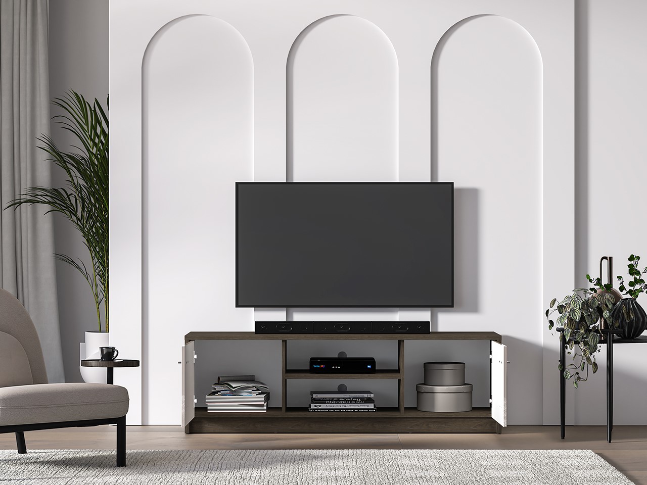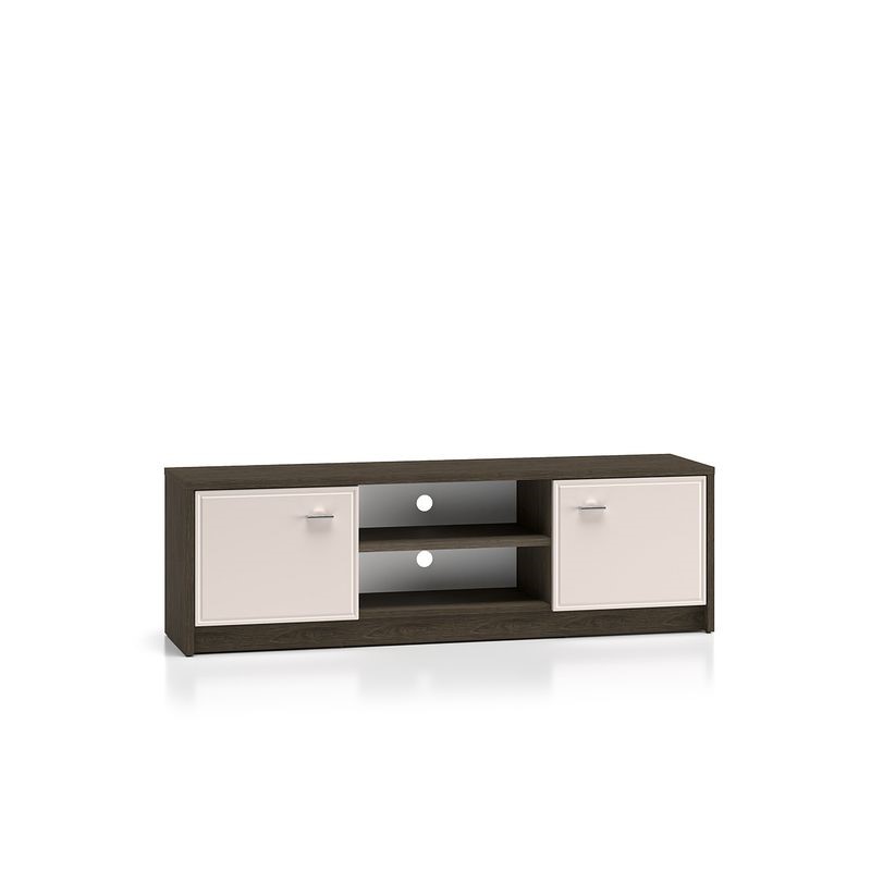 Szafka RTV z serii TOSCANIA doskonale łączy klasyczny styl z funkcjonalnością. Przestronne wnęki i zamykane szafki ułatwiają przechowywanie urządzeń i akcesoriów, a eleganckie frezowania i drewniane wykończenie tworzą przytulną atmosferę w salonie.
