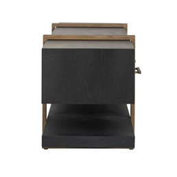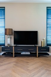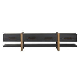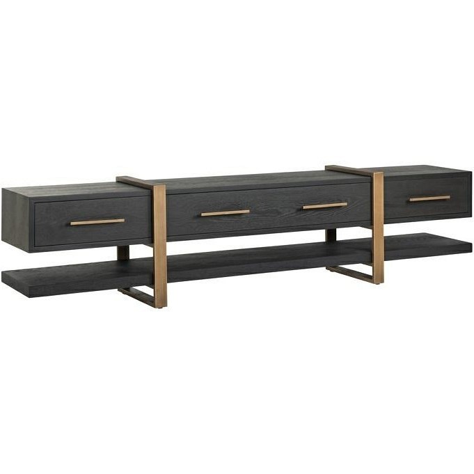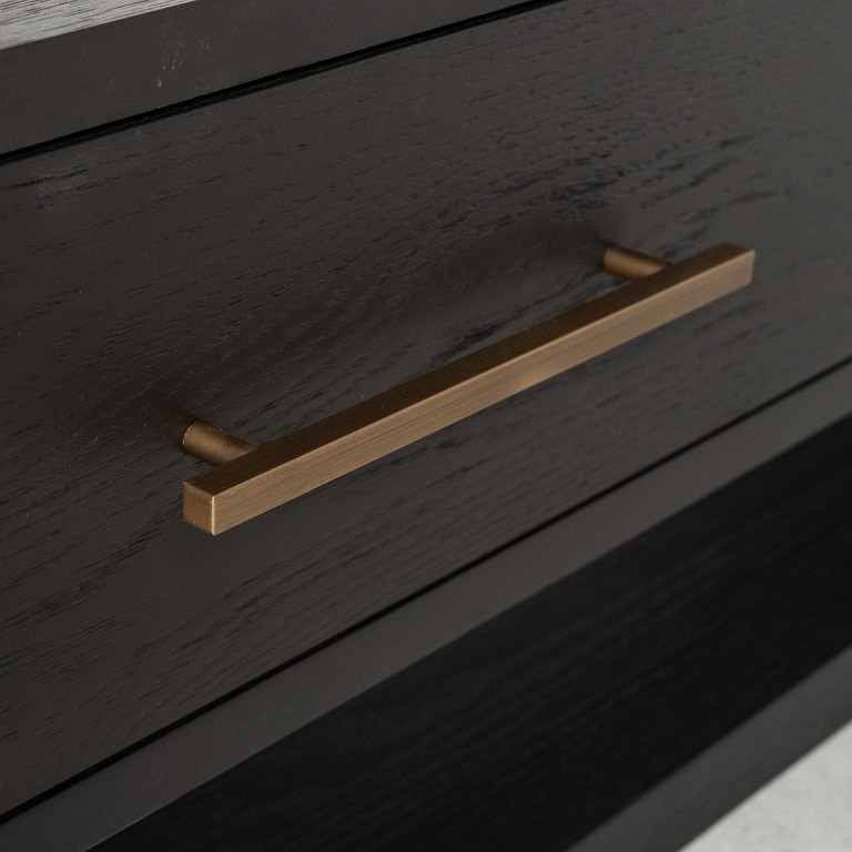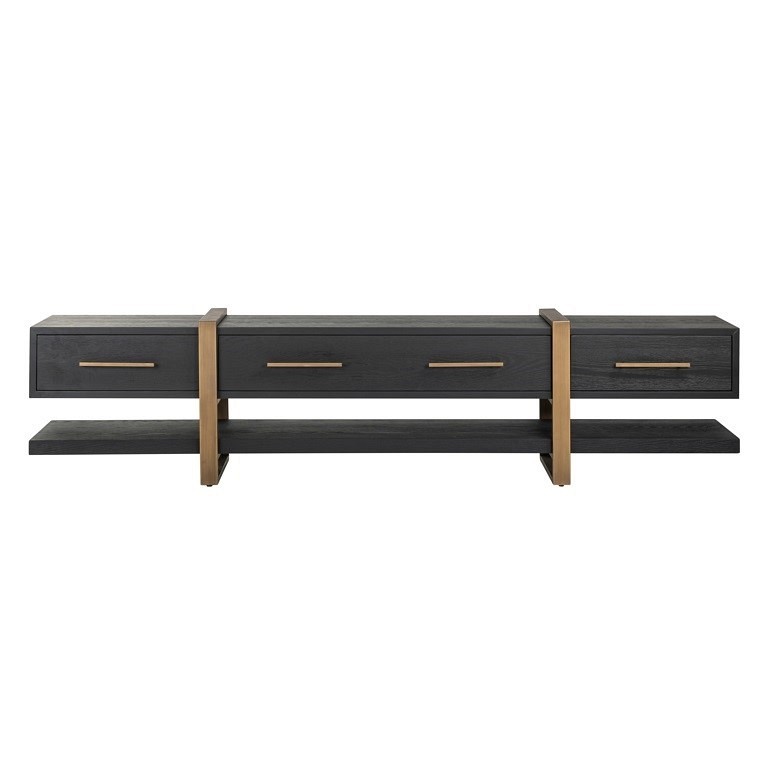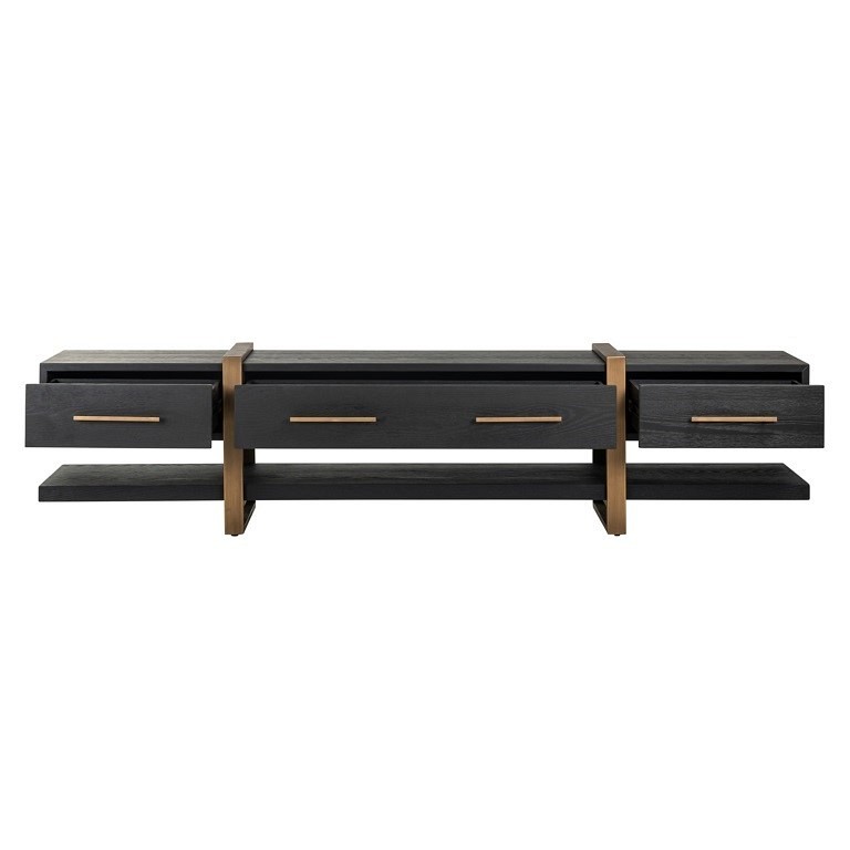 Kolekcja Cambon to połączenie szykownego forniru dębowego w czarnym odcieniu z mosiężnymi elementami. Szafka RTV Cambon to ponadczasowe oraz bardzo funkcjonalne rozwiązanie. Posiada 3 wysuwane szuflady oraz 1 rozległą otwartą półkę, na której można wyeksponować akcesoria telewizyjne oraz ulubione dekoracje.