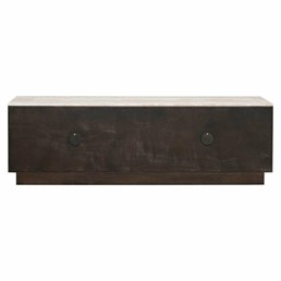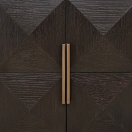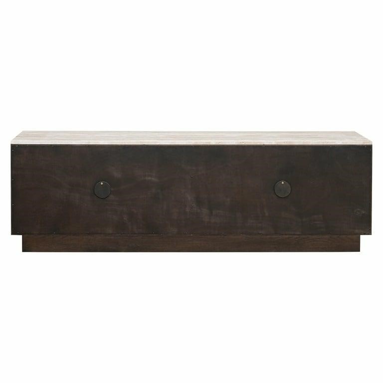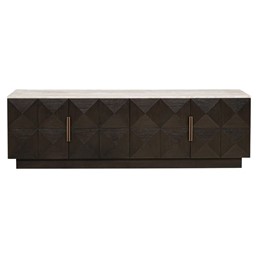 Szafka RTV Claremont to połączenie funkcjonalności z wyjątkowym designem, które zachwyci miłośników nowoczesnych wnętrz. Wykorzystanie najwyższej jakości materiałów, takich jak ciemnobrązowy dąb i efektowne powierzchnie z trawertynu, nadaje meblowi wyrafinowanego charakteru. Składający się z geometrycznych detali wzór „siatki piramidalnej” dopełnia artystycznego wyrazu, czyniąc tę szafkę idealnym dodatkiem do stylowego salonu.