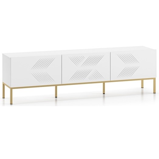Nowoczesna szafka RTV Clearing 04 w odcieniu białego alpejskiego z elegancką złotą podstawą to stylowy element wnętrza. Wytrzymała płyta laminowana i obrzeże ABS gwarantują trwałość i odporność na uszkodzenia. Złoty kolor podstawy dodaje wnętrzu elegancji i subtelnego blasku, podkreślając wyjątkowy charakter mebla.
