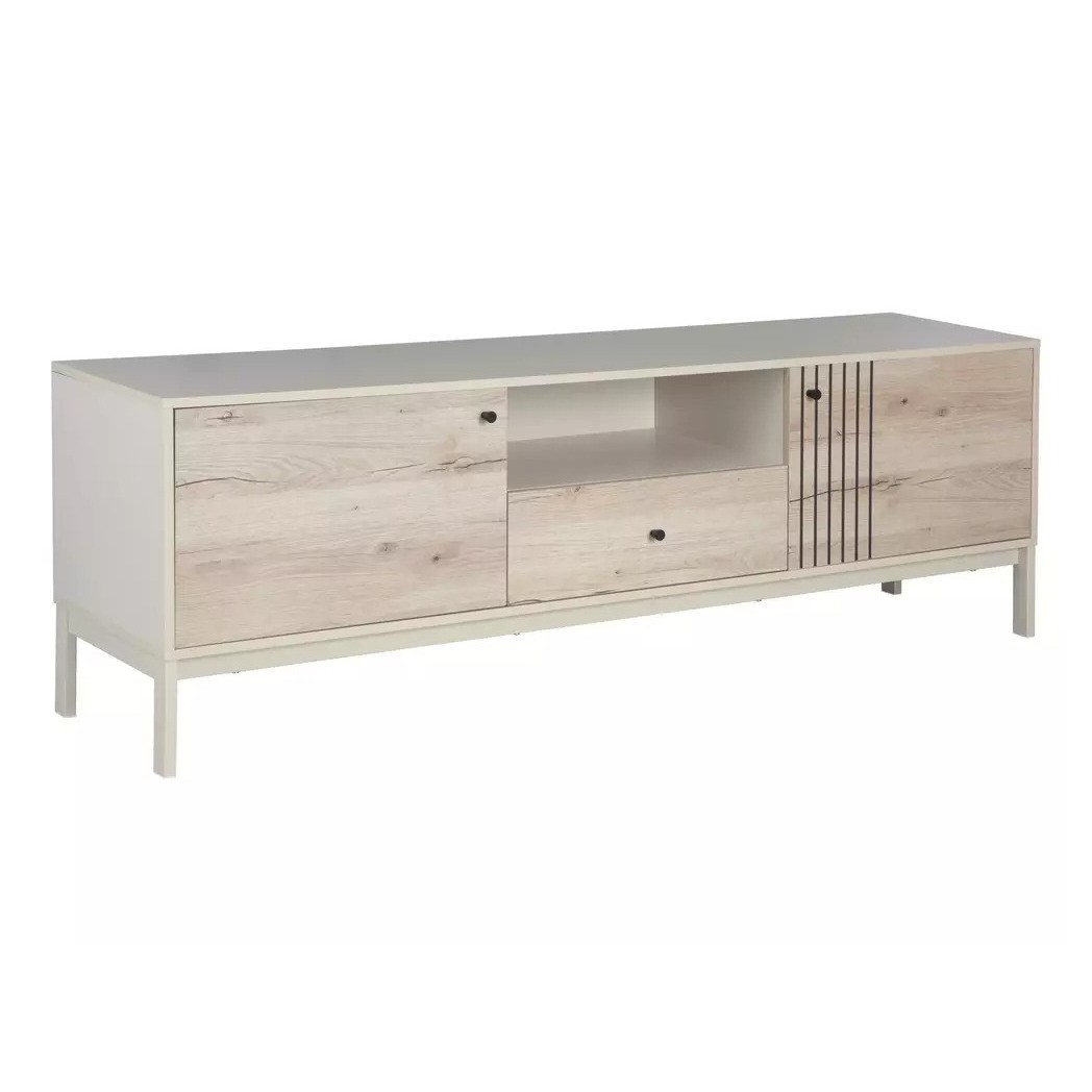 Prezentowana szfka łączy elegancki design z funkcjonalnością. Wykonany z wysokiej jakości laminowanej płyty meblowej, zapewnia trwałość i stabilność konstrukcji. Kolorystyka nadaje mu uniwersalny charakter, pasujący do różnych aranżacji wnętrz. Stolik wyposażony jest w przestronną półkę, szufladę i zamknięte szafki, umożliwiające przechowywanie sprzętu RTV oraz akcesoriów.