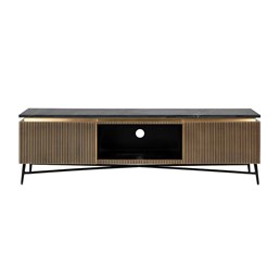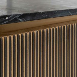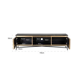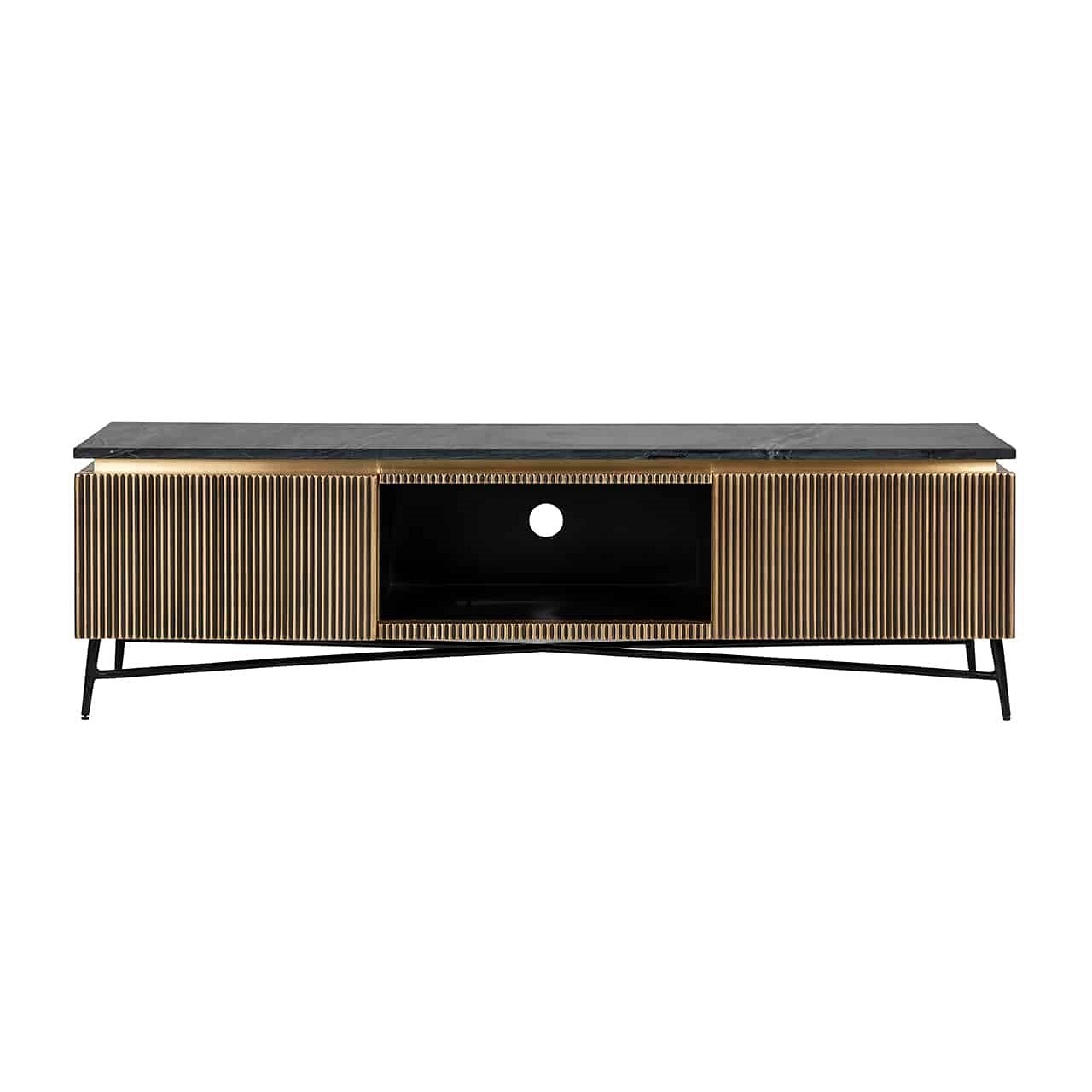 Dwudrzwiowa szafka pod telewizor IRONVILLE to bardzo elegancki i funkcjonalny mebel. Blat z grubego, czarnego marmuru świetnie komponuje się z mosiężnym korpusem. Wnętrze zrobione z mocnej płyty MDF oraz brzozowej sklejki kryje w sobie dwie pojemne komory. Rzeźbione drzwiczki wzmocniono i wykończono mosiądzem. Całość opiera się na solidnych żelaznych nogach w kolorze czarnym, które zabezpieczono stopkami.