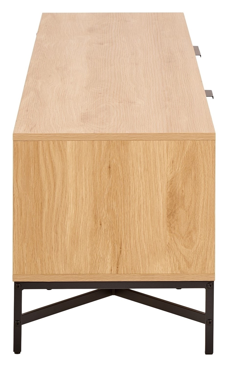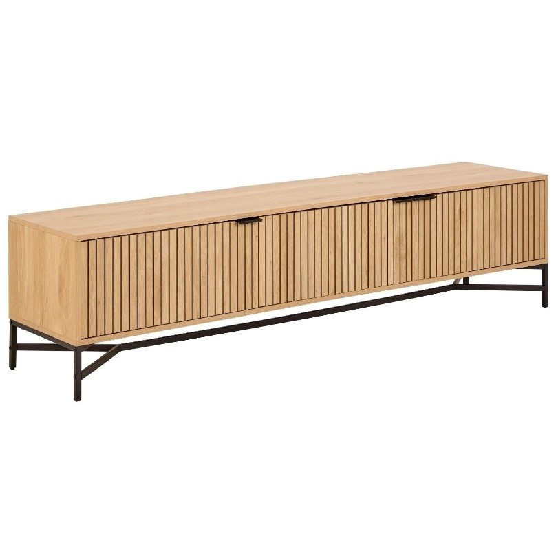 Szafka RTV Jaipur to połączenie elegancji z funkcjonalnością. Wykonana z wysokiej jakości materiałów, łączy ciepło naturalnego dębu z nowoczesnym czarnym wykończeniem. Przemyślany układ półek zapewnia miejsce na sprzęt RTV, książki czy dekoracje, tworząc estetyczny i praktyczny element wyposażenia salonu.