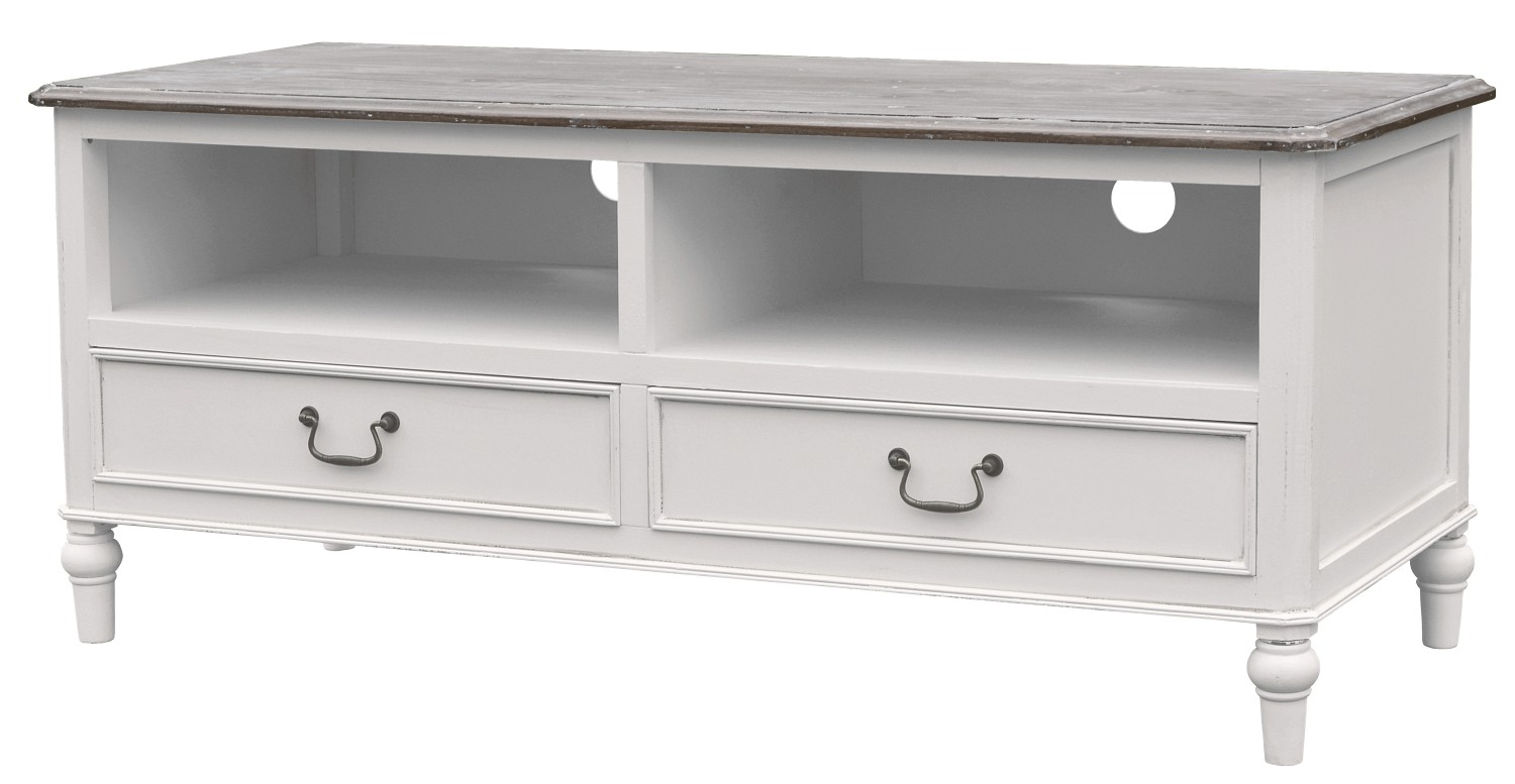 Nawet w mieszkaniu urządzonym w stylu prowansalskim, który potrafi cofnąć nas w czasie, potrzebujemy nowoczesnych sprzętów. Kolekcja Ravenna wychodzi naprzeciw naszym potrzebom. Oferuje szafkę RTV, na której z powodzeniem postawimy telewizor, a we wnęce umieścimy konsolę lub kino domowe. Otwory na tylnej ściance ułatwiają przeciągnięcie okablowania W dwóch szufladach możesz umieścić mniejsze przedmioty np.: piloty lub plyty.