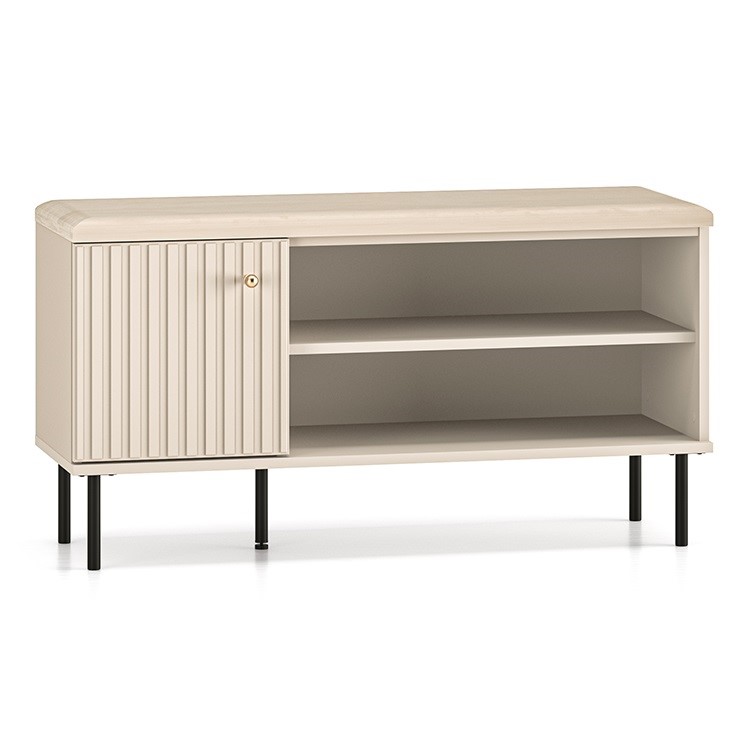 Szafka Sophie 1D to praktyczny i wygodny mebel do przedpokoju, z dużą przestrzenią na buty za drzwiami oraz otwartymi wnękami. Tapicerowane siedzisko zapewnia komfort użytkowania, a zawiasy z funkcją cichego domyku oraz solidne wykonanie z frezowanymi frontami MDF podkreślają elegancki charakter tej kolekcji.