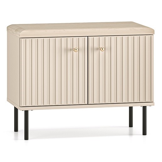 Szafka Sophie 2D to elegancki mebel, który oferuje dużo miejsca na buty za podwójnymi drzwiami. Tapicerowane siedzisko dba o wygodę podczas codziennych czynności, a zawiasy z cichym domykiem i czarne nóżki dodają nowoczesnego stylu i ułatwiają sprzątanie, oferując nieograniczony dostęp do podłogi.
