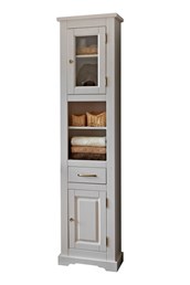 Szafka łazienkowa ROMANTIC wykonana jest z drewna i ma wysokość 190 cm. Posiada otwierane i zamykane półki oraz szufladę. Górny front szafki jest przeszklony, co dodaje szafce uroku. Szafka zapewni miejsce na kosmetyki, detergenty i akcesoria łazienkowe, które wraz z pozostałymi meblami z kolekcji stworzą niepowtarzalny zestaw mebli łazienkowych, który zadowoli nawet najtrudniejszego użytkownika.