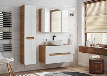 Szafka łazienkowa z lustrem Aruba stanie się sercem Twojej eleganckiej łazienki. Jej lekki i nowoczesny design w połączeniu z korpusami i frontami w kolorze drewna tworzą harmonijną całość, która od razu przeniesie Cię do egzotycznych zakątków. Zaokrąglone boki dodają szafce niepowtarzalnego charakteru, jednocześnie chroniąc ją przed nieprzyjemnymi uszkodzeniami. Bezuchwytowe rozwiązanie ergonomiczne, inspirowane kształtem podfrezowań, nie tylko nadaje meblom elegancki wygląd, ale także zapewnia wygodę użytkowania, eliminując problem kurzu, śladów palców czy drobnych zarysowań. Dzięki systemowi krytych prowadnic każde otwarcie szuflady jest płynne i delikatne, co dodatkowo podnosi jakość użytkowania mebla.