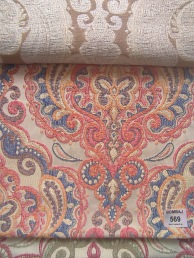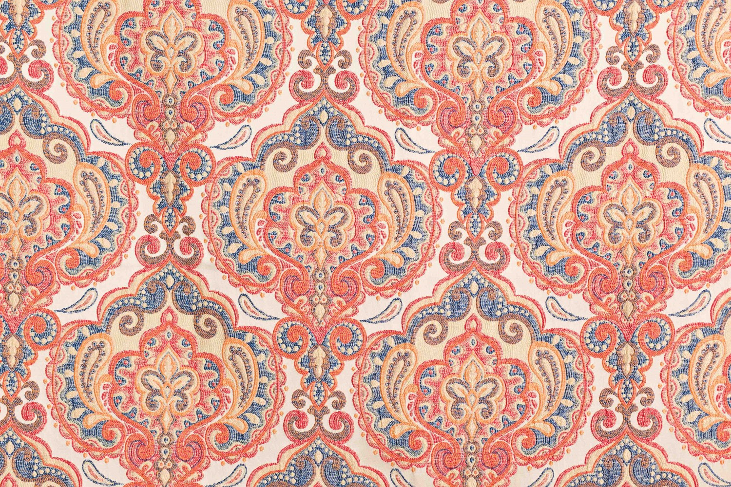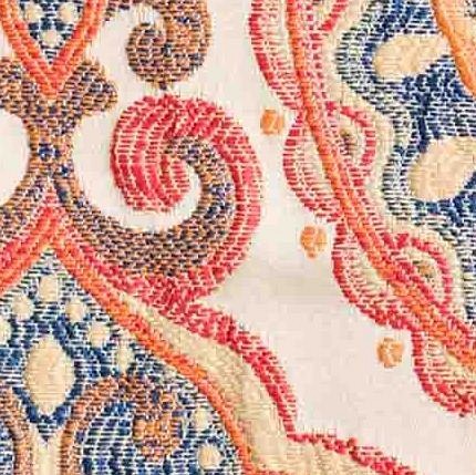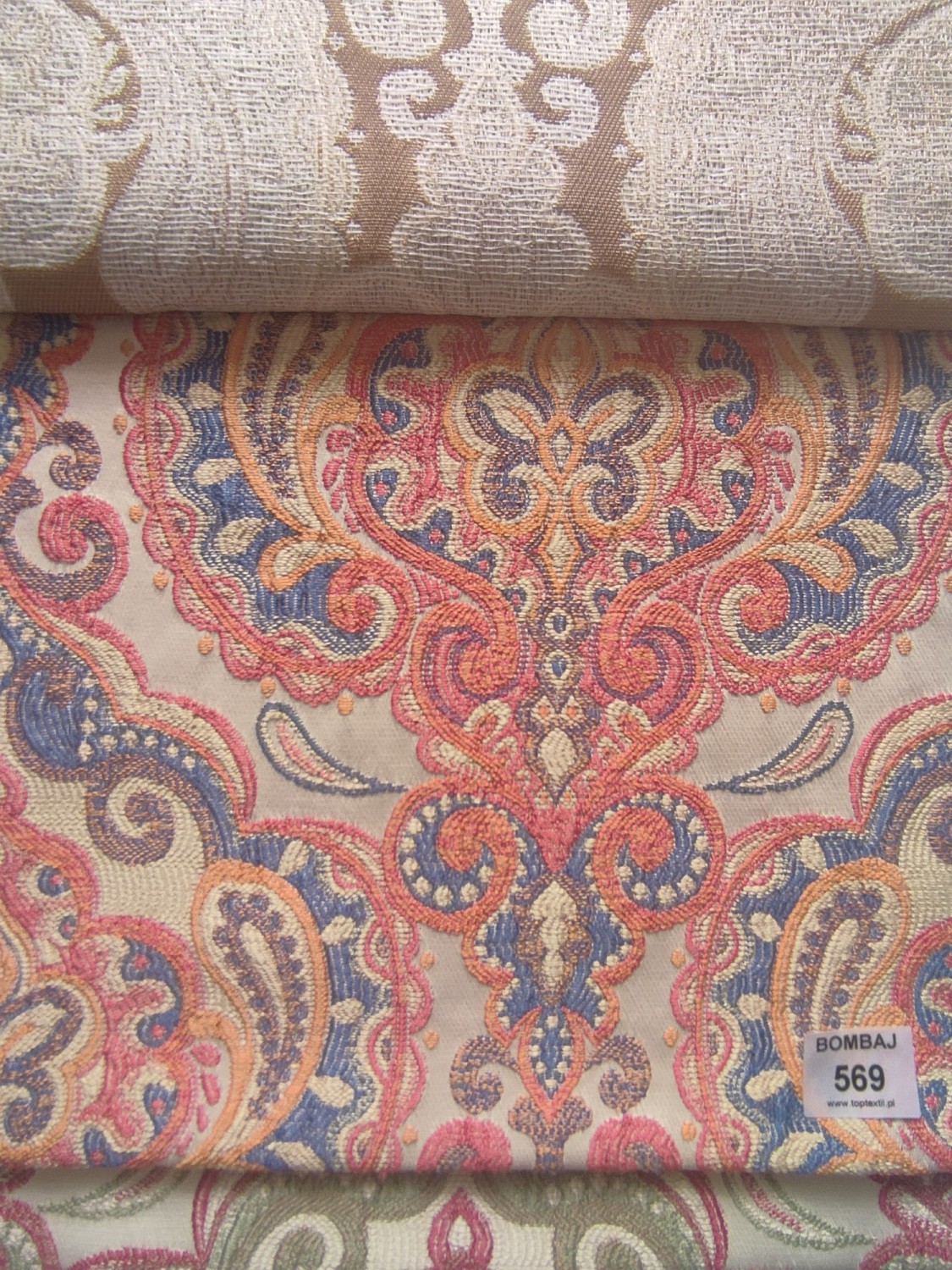 Kolekcja Bombaj, czyli bogato zdobiona tkanina inspirowana indyjskimi wzorami. Idealna do stylizowanych, wyrazistych wnętrz. Orientalne, indyjskie, dekoracyjne i bardzo oryginalne tkaniny.Paleta barw, która została użyta do wykonania tkaniny, rewelacyjnie ociepli twoje wnętrze i doda mu pazura!Ogromnym plusem materiału jest łatwość czyszczenia.