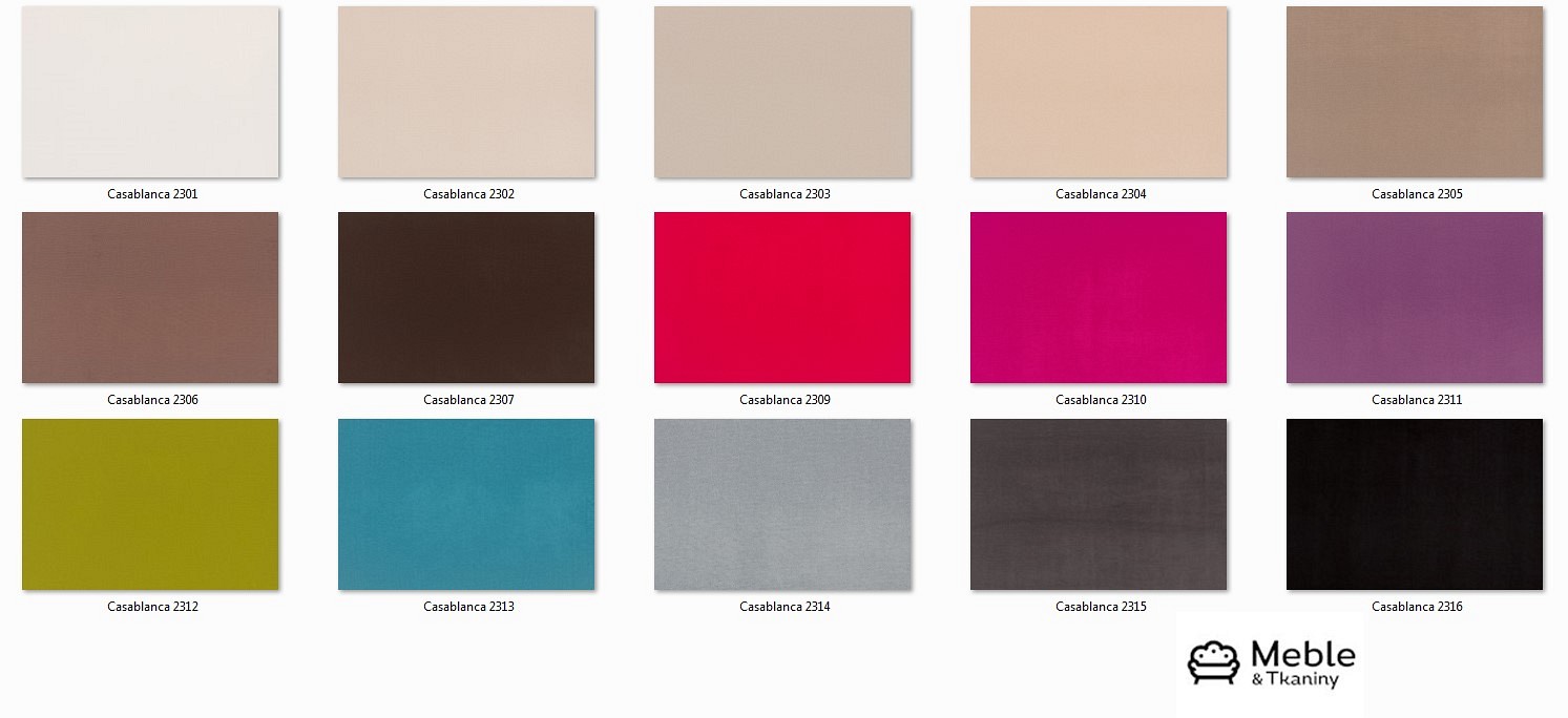 Dzianina w 100% poliestrowa o dużej odporności na ścieranie. Welurowa, lekko połyskująca. Miękka i przyjemna w dotyku, bardzo wytrzymała. 16 wariantów kolorystycznych pozwala na nieograniczone zestawianie barw. Kolory żywe, mocno nasycone, przyciągające wzrok. Tkanina wyprodukowana w technologii "CLEANABOO", co znacząco wpływa na komfort użytkowania. Ograniczają wchłanianie wody, dzięki czemu minimalizują ryzyko zniszczenia mebla poprzez plamy z herbaty, kawy, soku czy wina.