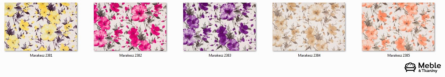 Kolekcja Marakesz to wiosenna fantazja. Liczne kwiaty w wielu kolorach, sprawiają, że od razu czujemy zapach łąki. Delikatna w dotyku, a jednocześnie wytrzymała i odporna na przecieranie. Idealnie ożywią smutne wnętrze, wnosząc tam odrobinę radości i szczyptę szaleństwa! Materiał wzbogacono o nowoczesną technologię Cleanaboo, która ułatwia czyszczenie i blokuje wchłanianie rozlanego płynu.