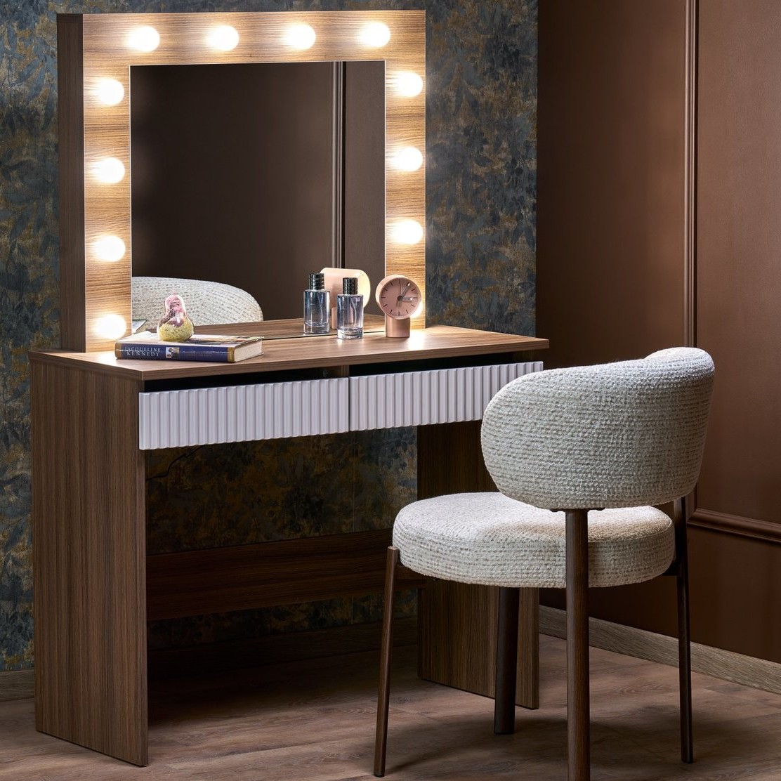 Prezentowana toaletka to elegancki i funkcjonalny mebel, który doskonale sprawdzi się w sypialni. Zapewnia wygodne miejsce do codziennej pielęgnacji oraz wykonywania makijażu. Praktyczny blat pozwala na uporządkowanie kosmetyków i akcesoriów w jednym miejscu. Szuflady ułatwiają przechowywanie drobnych przedmiotów, pomagając utrzymać porządek. Solidna konstrukcja gwarantuje stabilność oraz trwałość podczas użytkowania. Stylowy design sprawia, że toaletka stanowi również dekoracyjny element wnętrza. To połączenie wygody, funkcjonalności i estetycznego wyglądu.