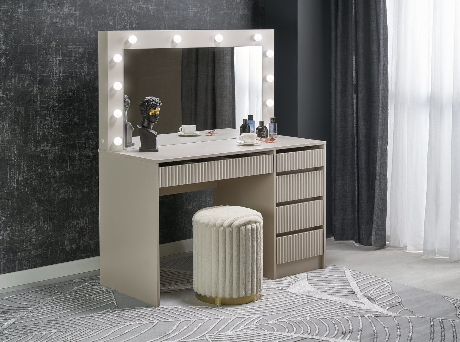 Toaletka HOLLYWOOD to elegancki i nowoczesny mebel, który stanie się idealnym miejscem do codziennej pielęgnacji i makijażu. Jej szeroki blat zapewnia przestrzeń na kosmetyki, akcesoria oraz dekoracje, dzięki czemu wszystko jest w zasięgu ręki. Wbudowane lustro z podświetleniem LED gwarantuje doskonałe oświetlenie, ułatwiając precyzyjne wykonanie makijażu o każdej porze dnia. Pojemne szuflady umożliwiają przechowywanie kosmetyków, biżuterii oraz innych drobiazgów, pomagając utrzymać porządek. Stylowy design sprawia, że toaletka doskonale komponuje się zarówno w nowoczesnych, jak i klasycznych wnętrzach. Solidna konstrukcja zapewnia stabilność i trwałość, co czyni ją praktycznym wyborem na lata.