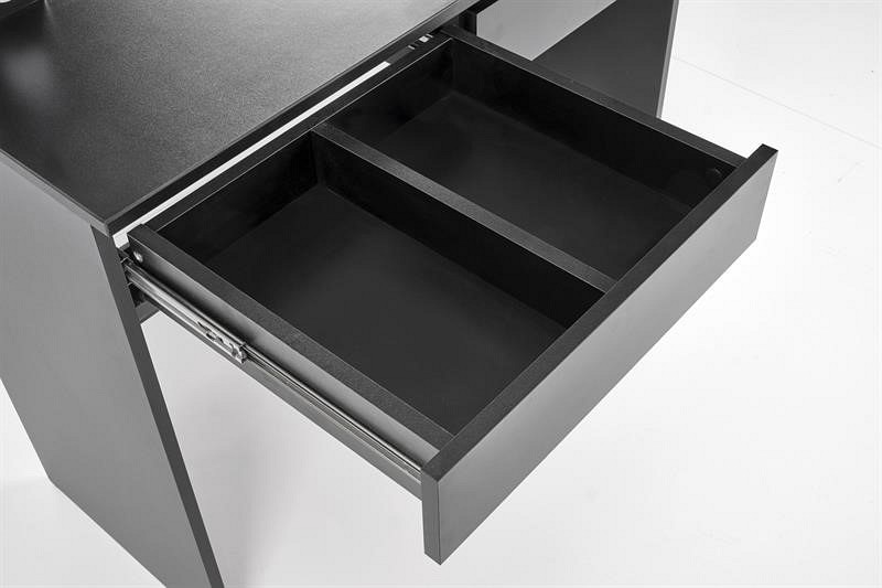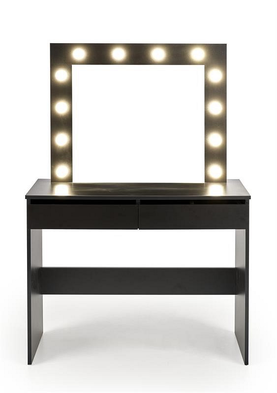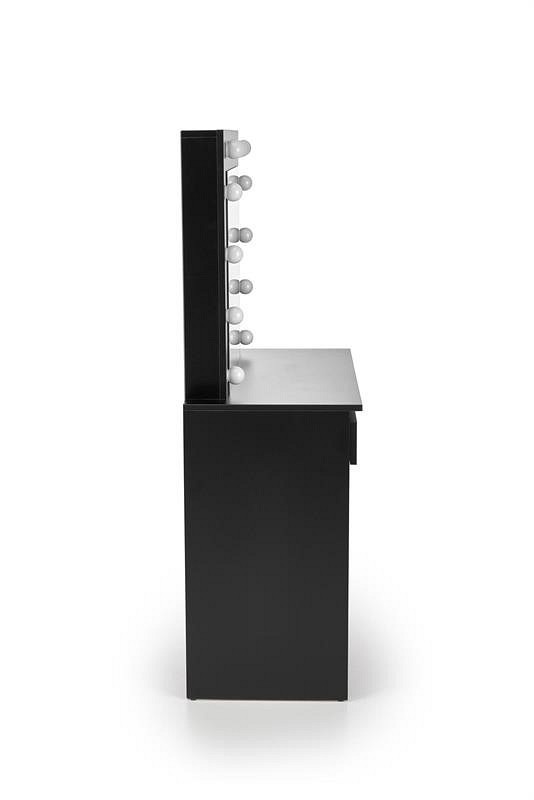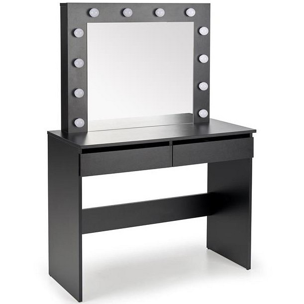 Czarna toaletka HOLLYWOOD wykonana jest z płyty meblowej sklejki. Model ten wyposażony jest w dwie praktyczne szuflady, które pomieszczą Twoje ulubione kosmetyki i akcesoria do makijażu w uporządkowany sposób. Pudełka posiadają również przegródki, w których poukładane są Twoje kosmetyki. Duże lusterko kosmetyczne jest oświetlane kulistymi żarówkami, które włącza się włącznikiem na bocznej ścianie lustra. Czarna toaletka HOLLYWOOD z powodzeniem odnajdzie się w różnych aranżacjach sypialni czy pokoi młodzieżowych.