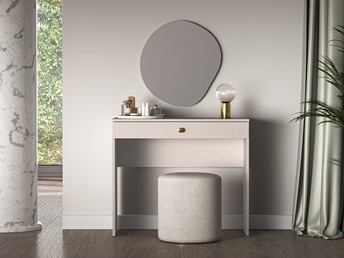 Toaletka Selgin 09 to stylowy mebel do sypialni. Praktyczne schowki pomieszczą kosmetyki i akcesoria, a elegancki blat z miejscem na lustro zapewni komfort podczas codziennej pielęgnacji. Wysokie nóżki dodają lekkości i ułatwiają utrzymanie czystości.