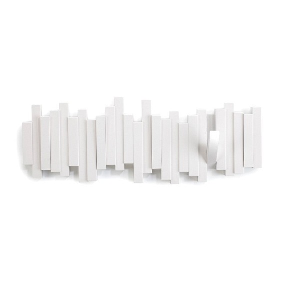 STICKS to wyjątkowy wieszak w kolorze białym. Wieszak wyszedł spod ręki znanej projektantki Helen T. Miller. Jest to awangardowy, niezwykle praktyczny wieszak, który w swojej bryle kryje 5 haczyków. Zestaw montażowy dołączony do zestawu. Udźwig jednego haczyka 2.25 kg Waga netto 1 szt.: 0.50 kg Waga opakowania: 1 kg Maksymalna ilość szt. w opakowaniu: 3 Sposób wysyłki: Paczka Produkt do samodzielnego montażu: Nie