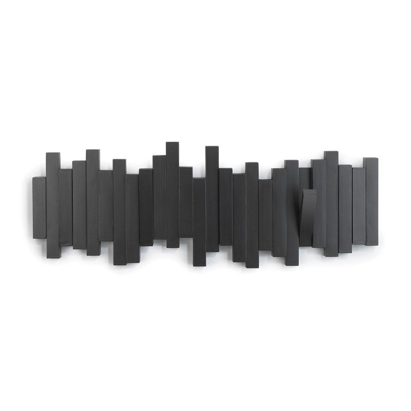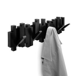 STICKS to wyjątkowy wieszak w kolorze czarnym. Wieszak wyszedł spod ręki znanej projektantki Helen T. Miller. Jest to awangardowy, niezwykle praktyczny wieszak, który w swojej bryle kryje 5 haczyków. Zestaw montażowy dołączony do zestawu. Udźwig jednego haczyka 2.25 kg Waga netto 1 szt.: 0.50 kg Waga opakowania: 1 kg Maksymalna ilość szt. w opakowaniu: 3 Sposób wysyłki: Paczka Produkt do samodzielnego montażu: Nie