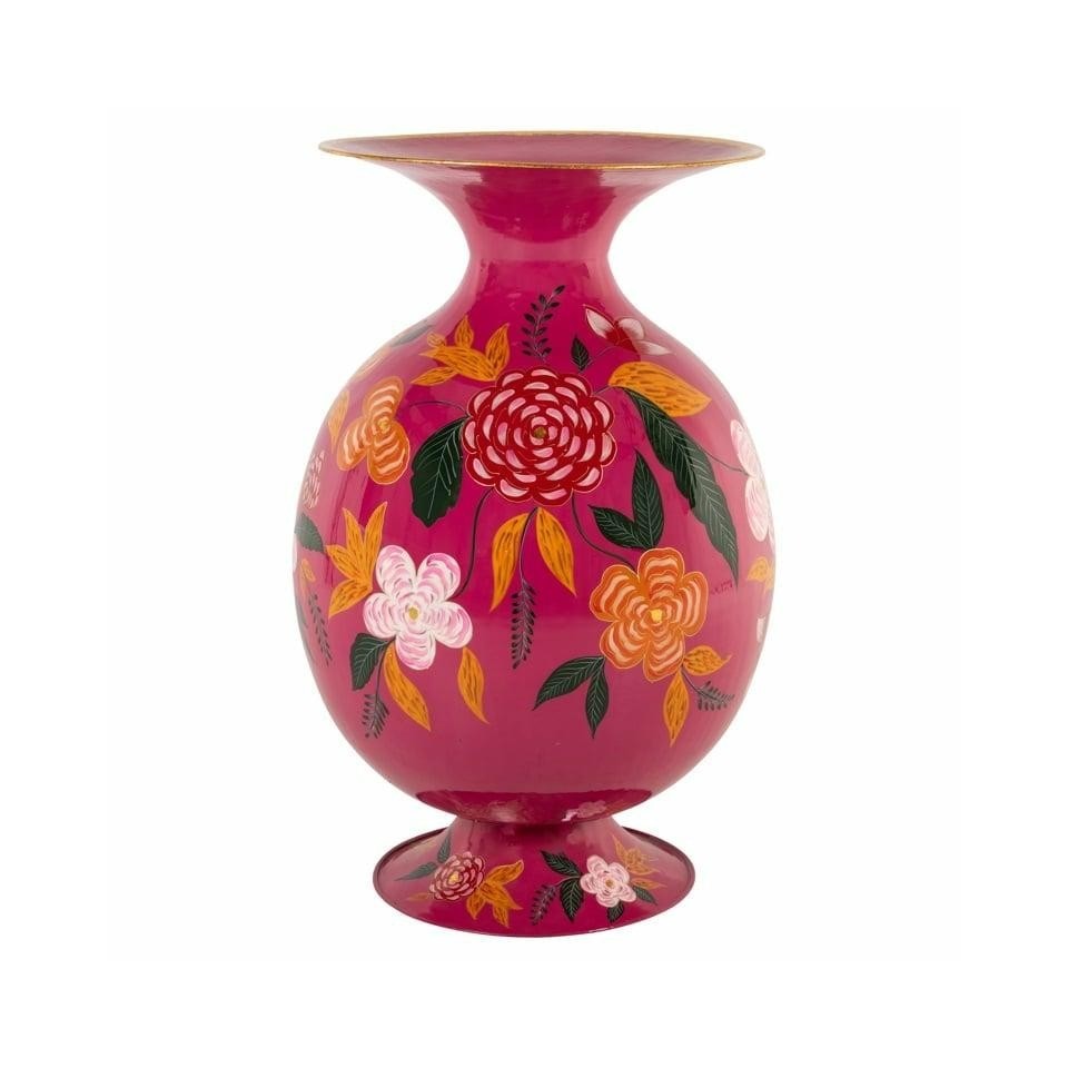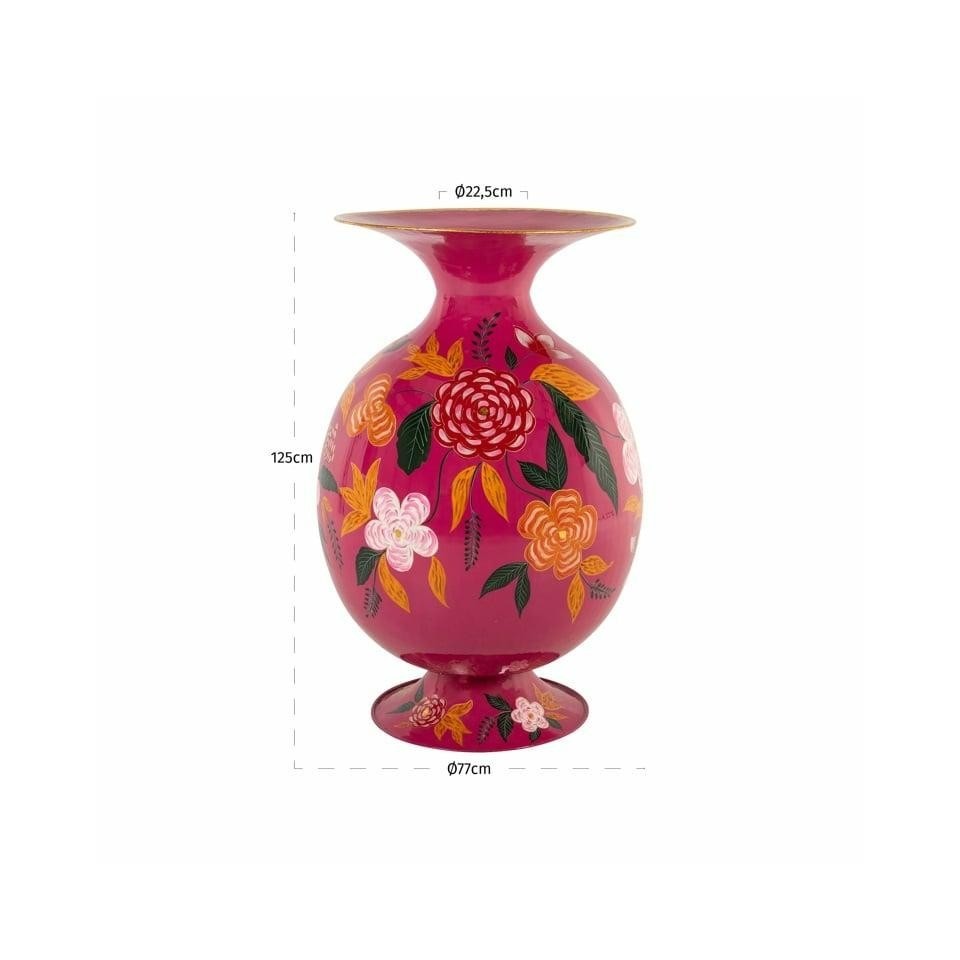 Wazon ALORA to wyrazista dekoracja, która natychmiast przyciąga wzrok bogactwem barw i artystycznym wykończeniem. Ręcznie malowany, kwiatowy wzór nadaje mu unikalnego charakteru, dzięki czemu każdy egzemplarz jest wyjątkowy. Ciemna, głęboka baza pięknie kontrastuje z intensywnymi odcieniami czerwieni, różu, zieleni i żółci, tworząc harmonijną kompozycję. Zaokrąglona forma wprowadza nutę klasyki i elegancji, a jednocześnie subtelnie nawiązuje do orientalnych inspiracji. Dzięki solidnej, metalowej konstrukcji pokrytej emalią wazon łączy trwałość z estetyką na najwyższym poziomie. Świetnie sprawdzi się jako ozdoba komody, konsoli czy parapetu, wprowadzając do wnętrza barwę i radosny akcent. To idealny wybór do aranżacji, które potrzebują mocnego, dekoracyjnego akcentu. Należy pamiętać, że wazon nie został pokryty powłoką hydrofobową i nie nadaje się do kontaktu z wodą.